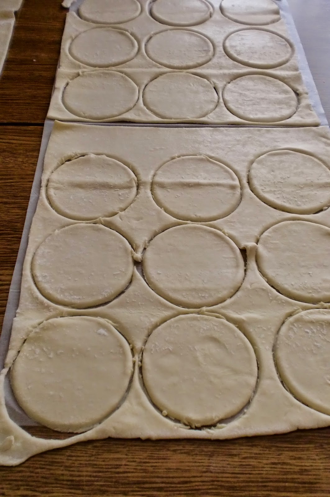 Extendemos el hojaldre, con un cortador de donuts (quien lo tenga) o un molde redondo cortamos circulos.