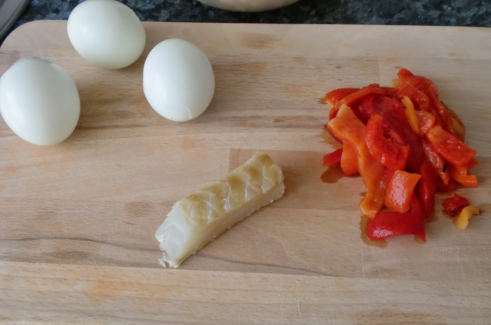 Cortamos los huevos, los piquillos y el bacalao en lascas.