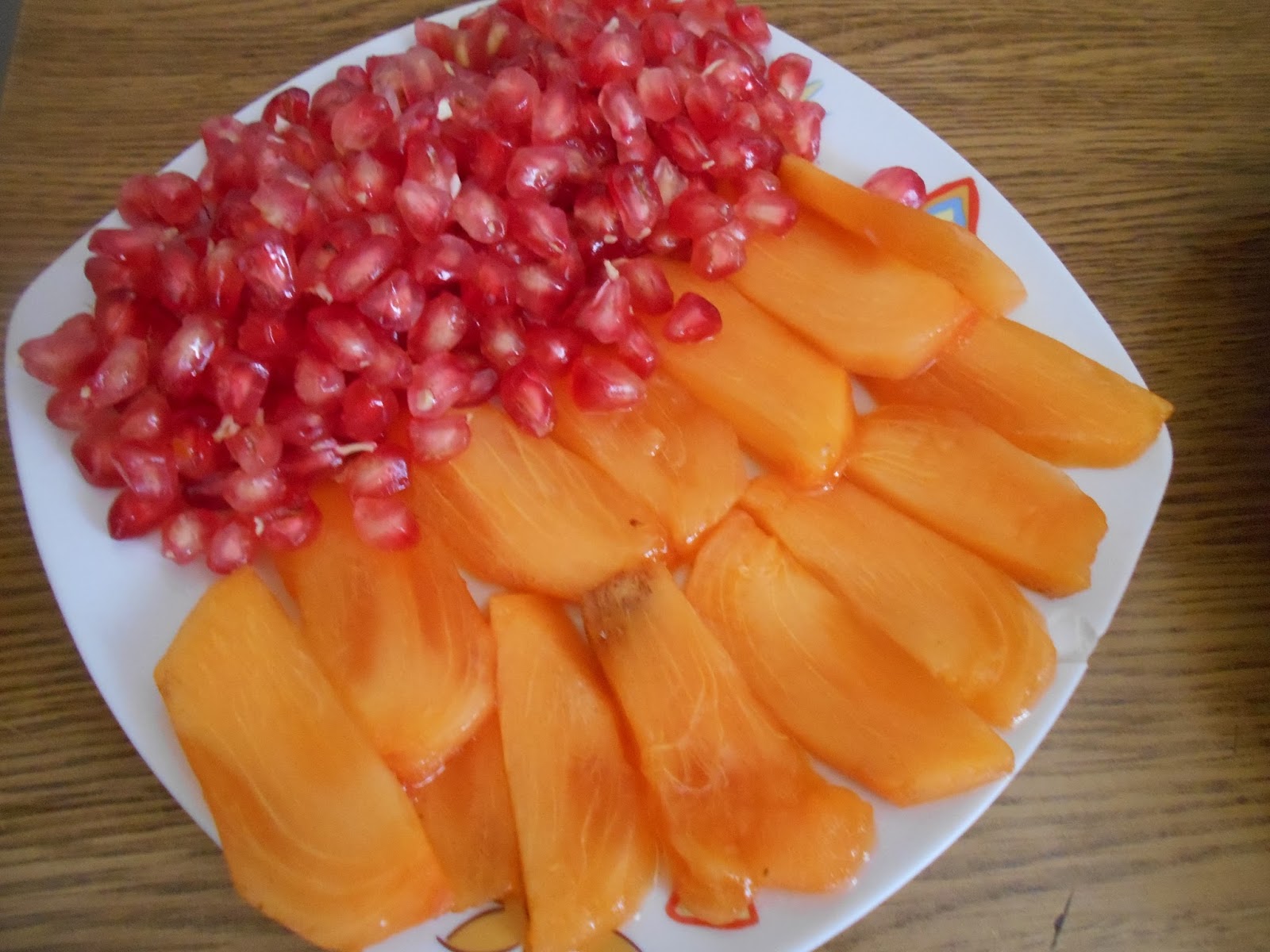 Cortamos el kaki persimon en rodajas no muy gruesas. Desgranamos la granada.