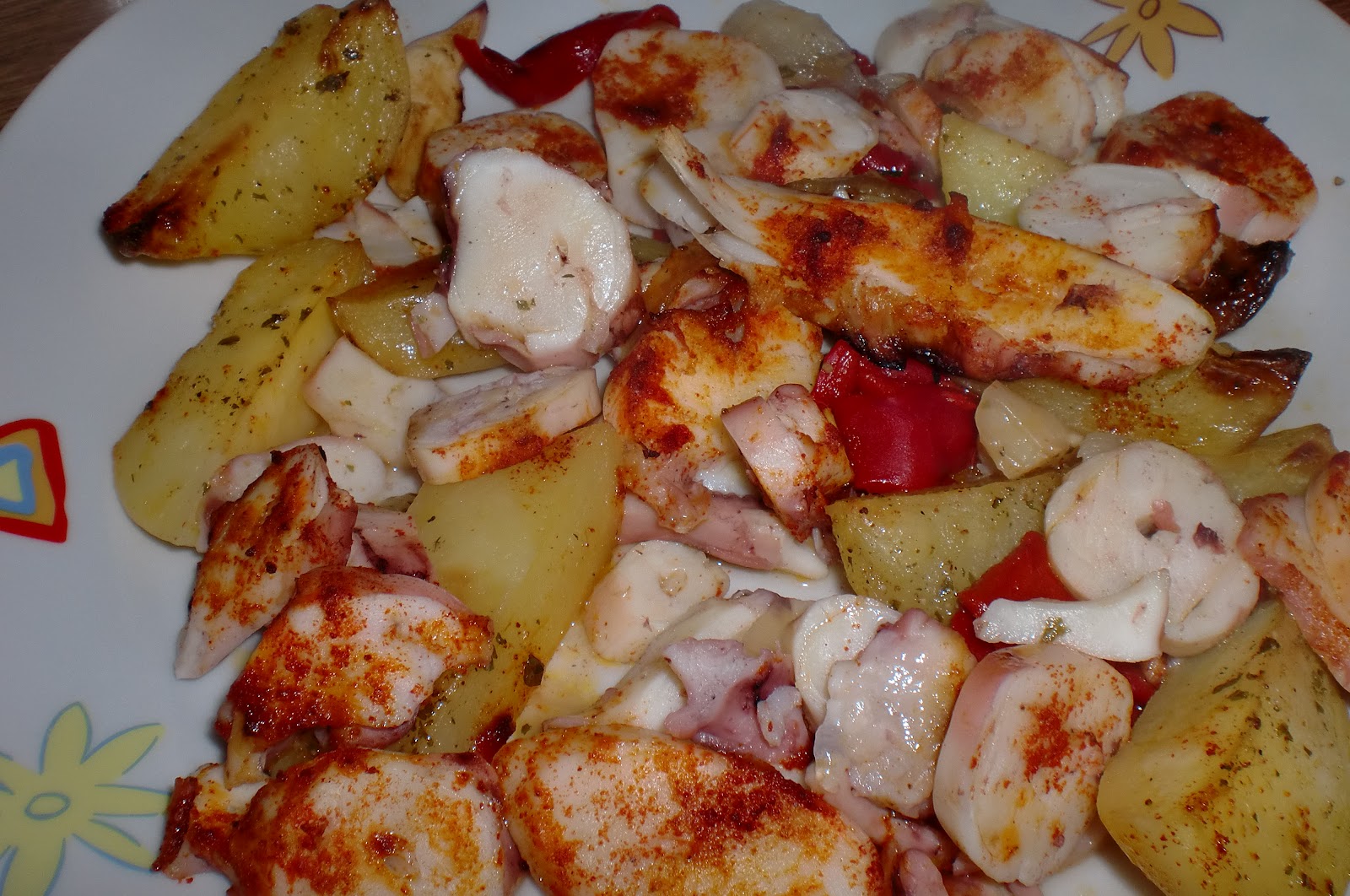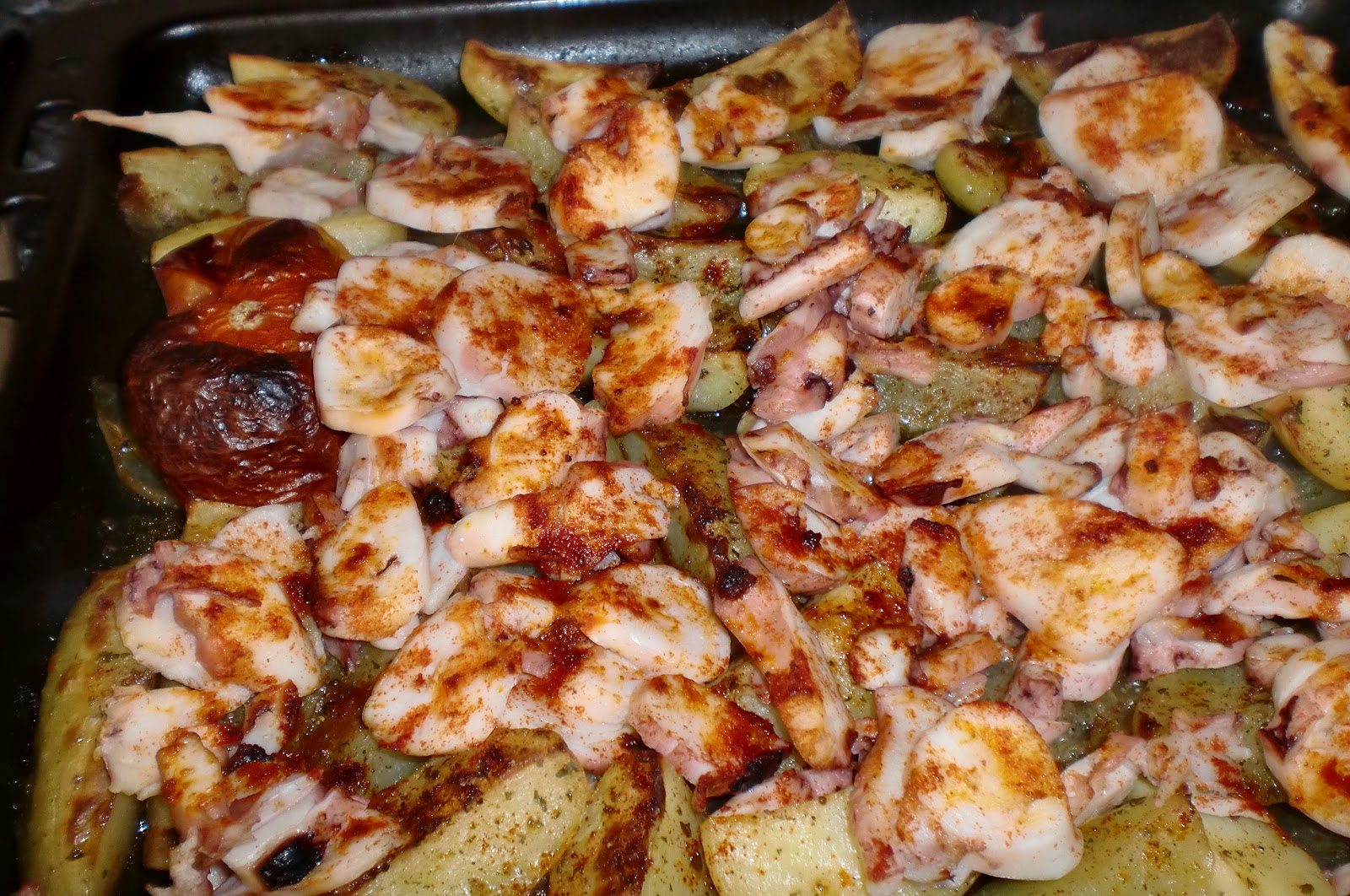 Cortamos en rodajas el pulpo y lo disponemos por encima de las patatas. Espolvoreamos con sal, pimentón y aceite. Horneamos unos minutos más.