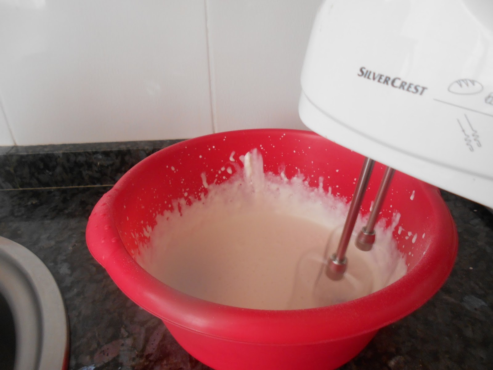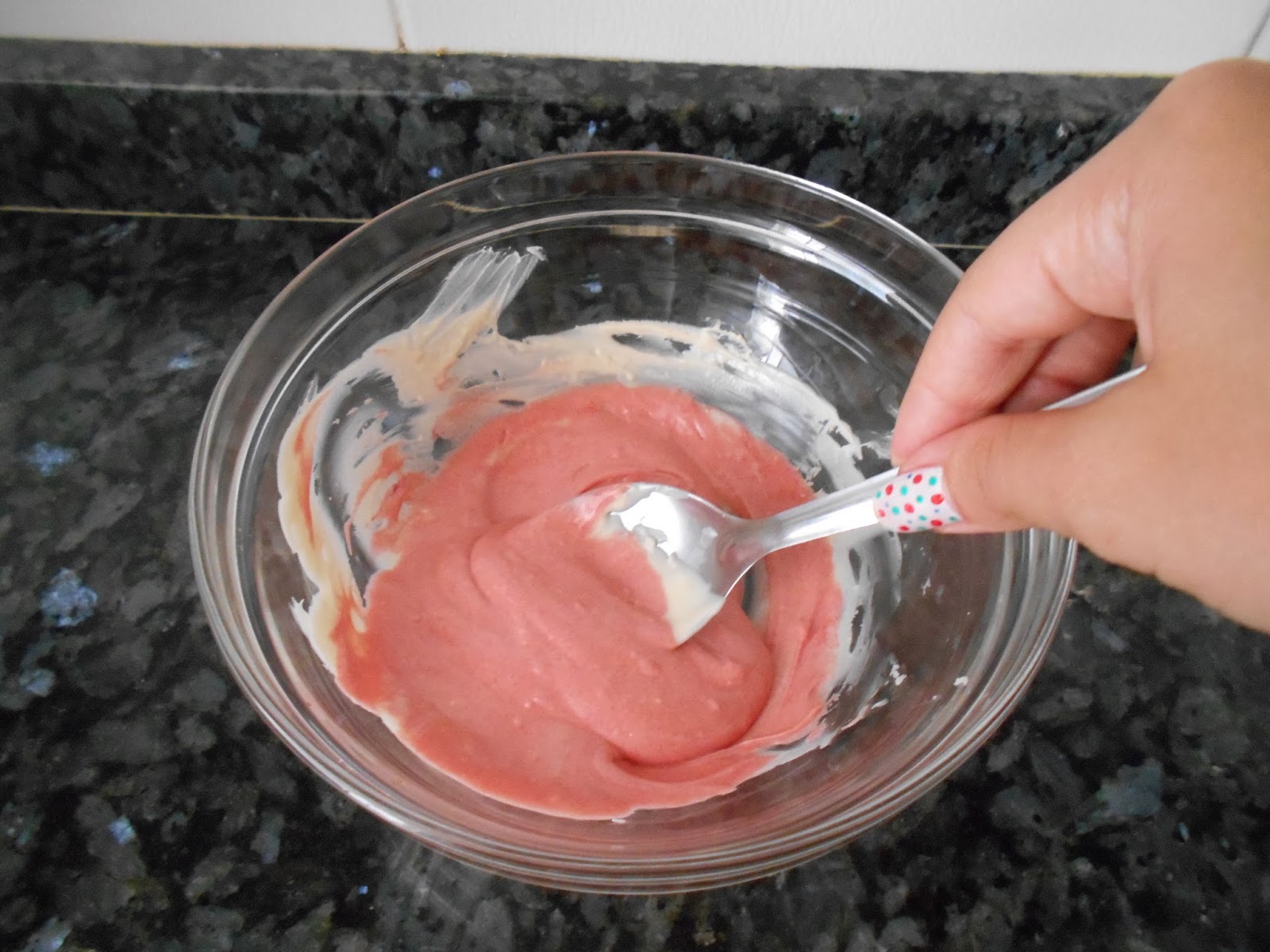 Añadimos el colorante rojo. Echad poco a poco hasta conseguir el rosa tan caracteristico de las Panteras Rosa