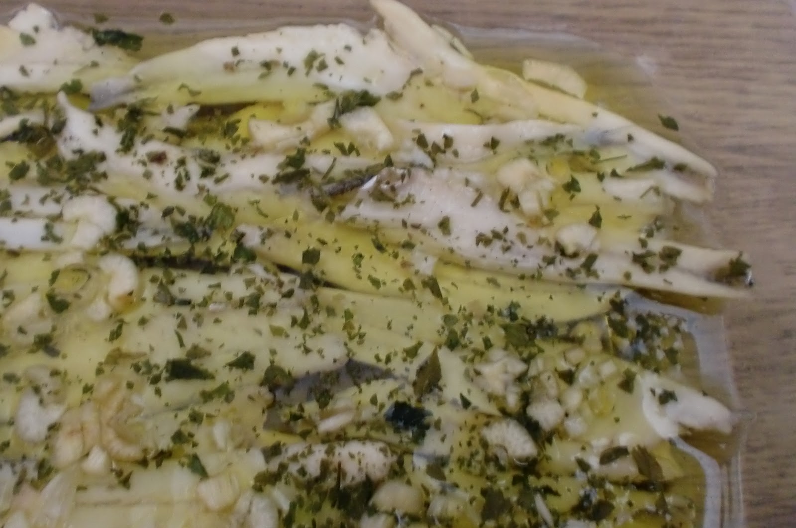 Se colocan en otro recipiente y los cubrimos con aceite de oliva al que añadiremos ajos picados y abundante perejil