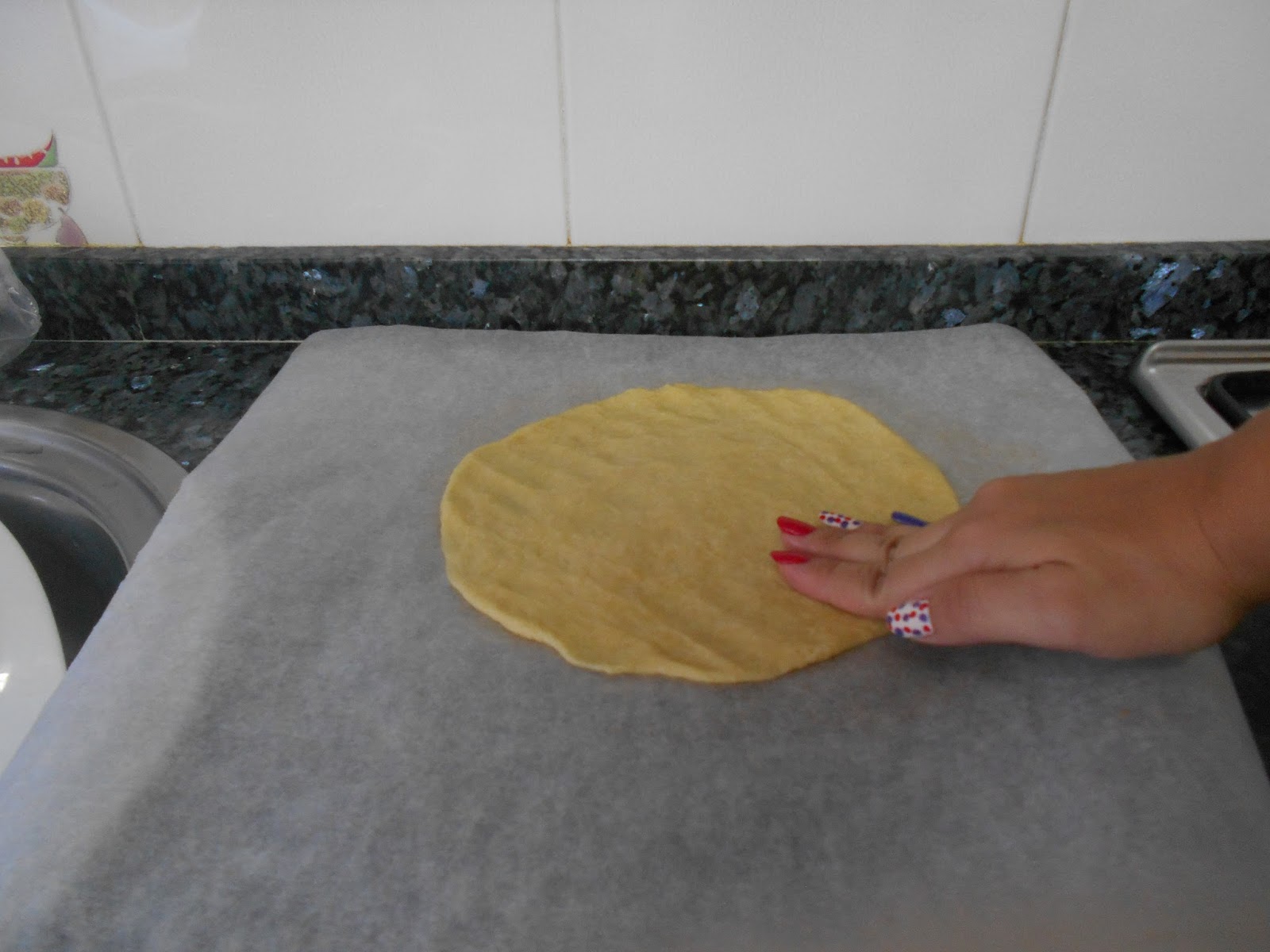 Extendemos la masa (la más pequeña) en una bandeja de horno. No es necesario poner papel , no se pega en la bandeja.