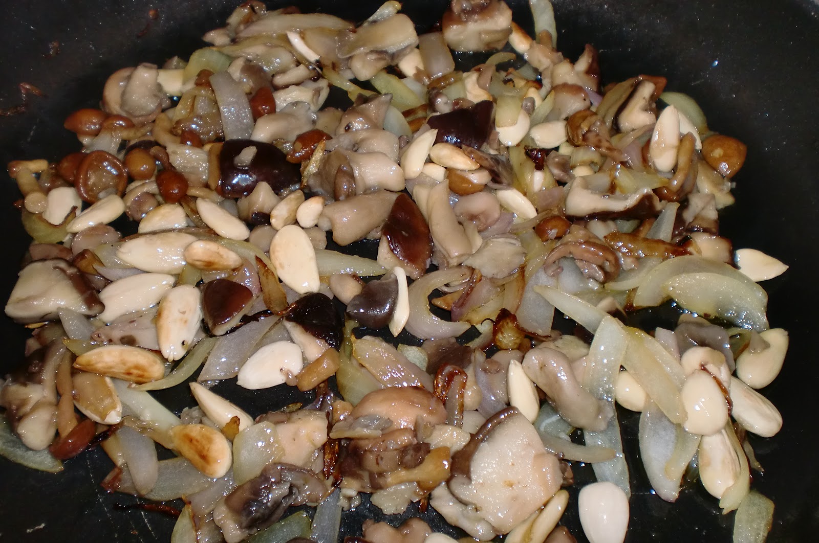 Añadimos las setas variadas, muy bien escurridas y lavadas y las sofreimos junto con las almendras y la cebolla.