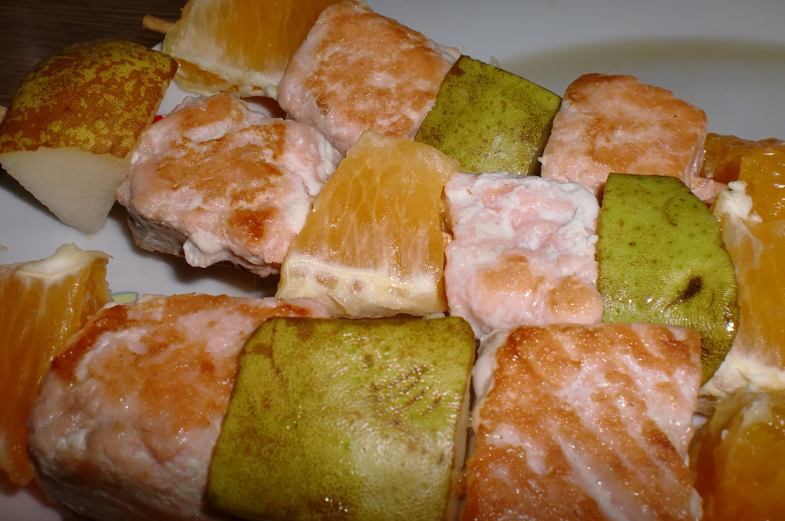 Ahora solo queda montar nuestras brochetas alternando los trozos de salmón, pera y naranja a vuestro gusto.