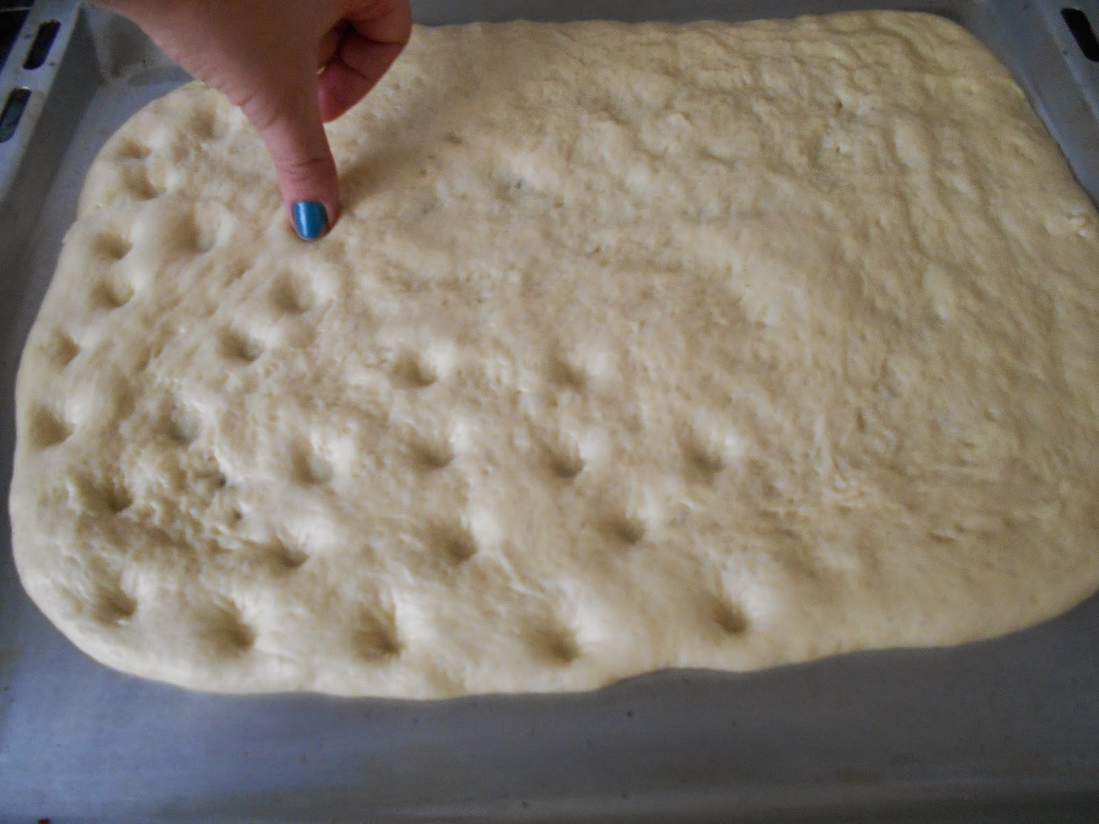 La disponemos en una bandeja de horno untada de aceite y dejamos levar de nuevo
