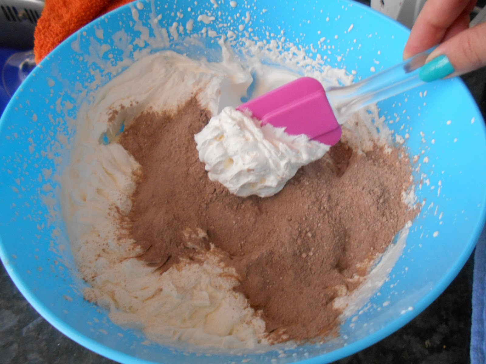 Hacemos el relleno. Montamos la nata y cuando este montada añadimos el cacao y el azucar en polvo.