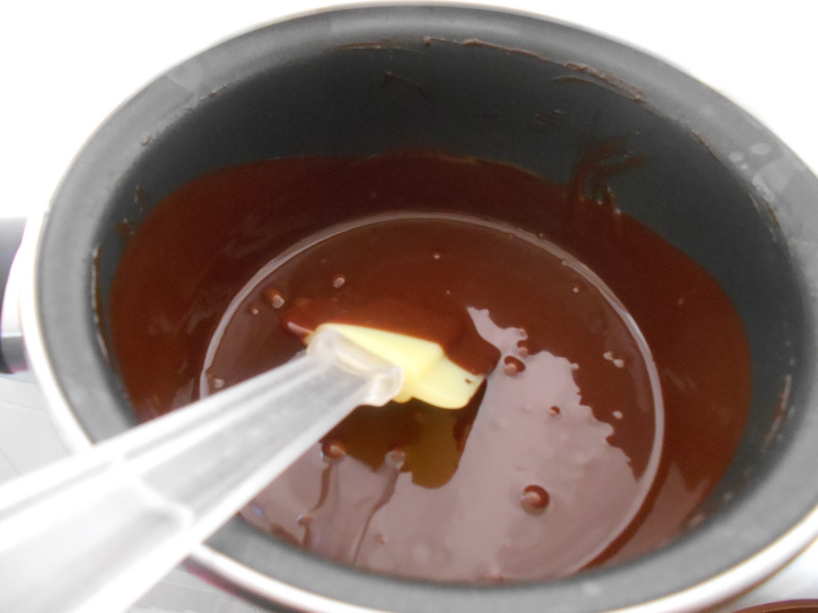 Hacemos entonces la cobertura. Vertemos la nata, la mantequilla y el chocolate en un cazo y cuando este todo disuelto apartamos y dejamos templar.