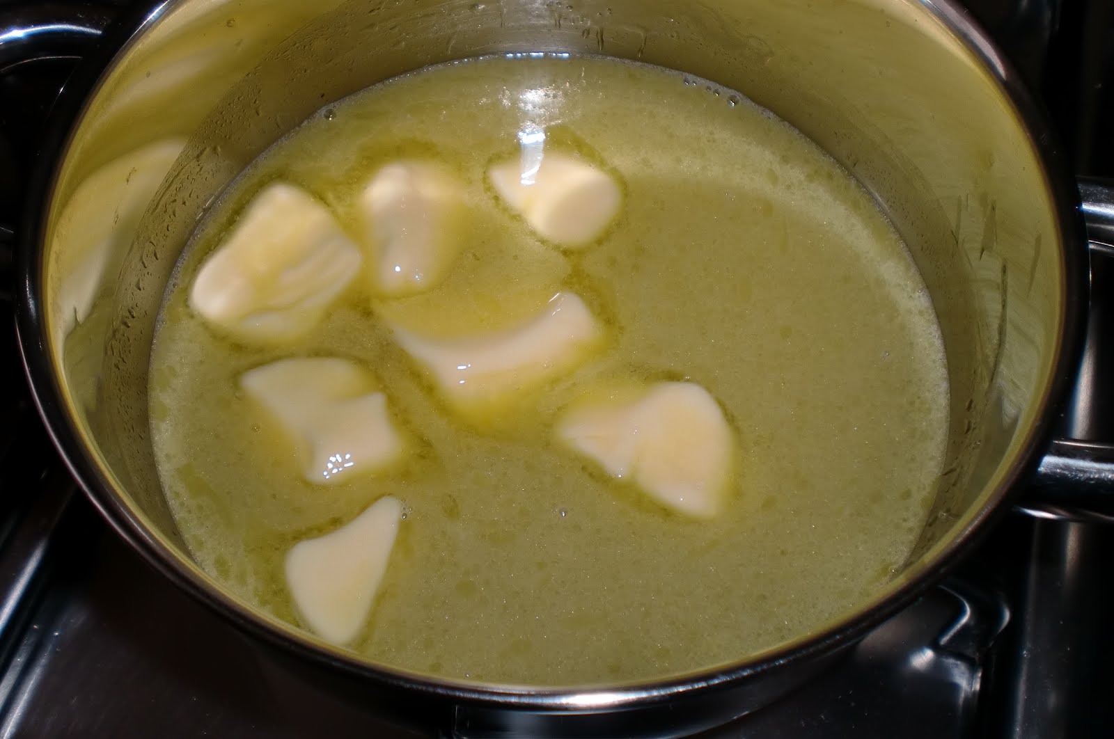 Para la masa, ponemos en un cazo la leche, el agua, la mantequilla, la sal y el azúcar, llevamos a ebullición a fuego medio.