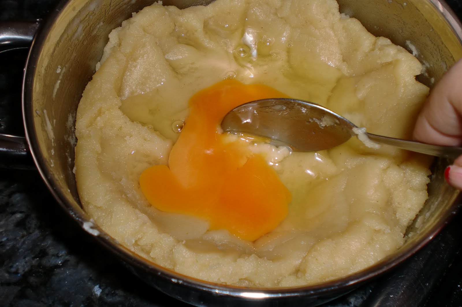 Verter la masa en un cuenco y añadir los huevos uno a uno. Añade un huevo y mezcla con una espátula, cuando la masa y el huevo se hayan homogeneizado incorpora el siguiente y así hasta terminar con los cuatro huevos.