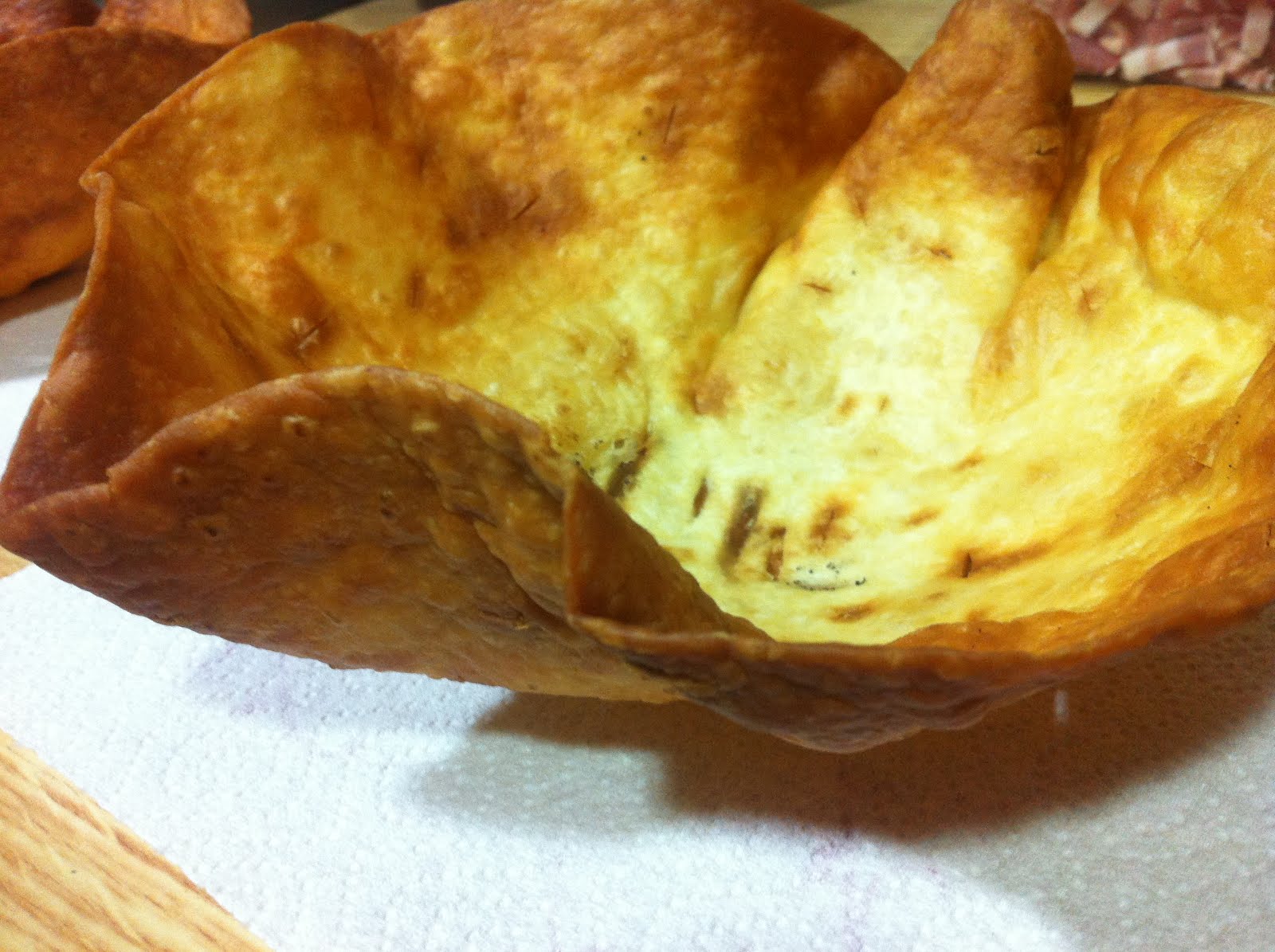 Cogemos la tortilla de trigo y la metemos en la freidora (tiene que ser freidora porque se tiene que cubrir por completo) y con la ayuda de un cazo ( de los de servir los guisos) aplastamos en el centro. Mejor os saldrá en cuanto más amplio sea el cazo.