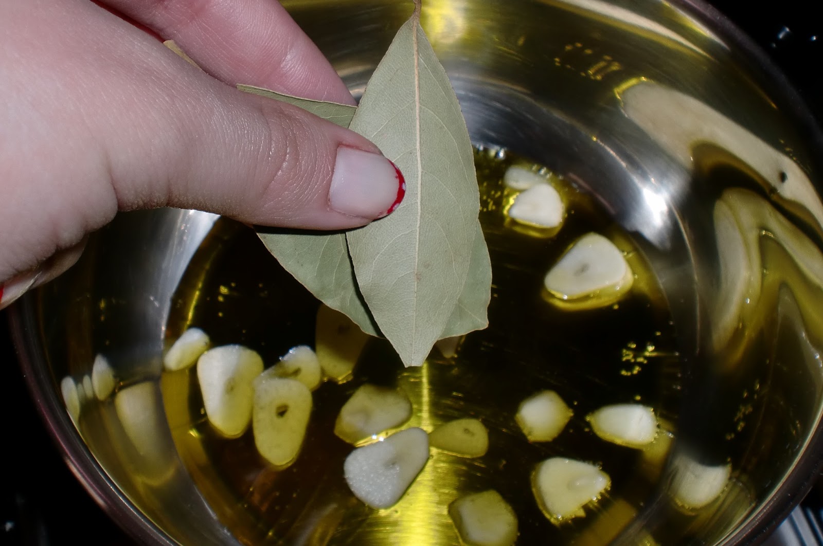 En una sartén pondremos el aceite y doraremos los ajos fileteados. Añadimos el laurel y dejamos enfriar un poco para que al añadir el pimentón este no se queme.