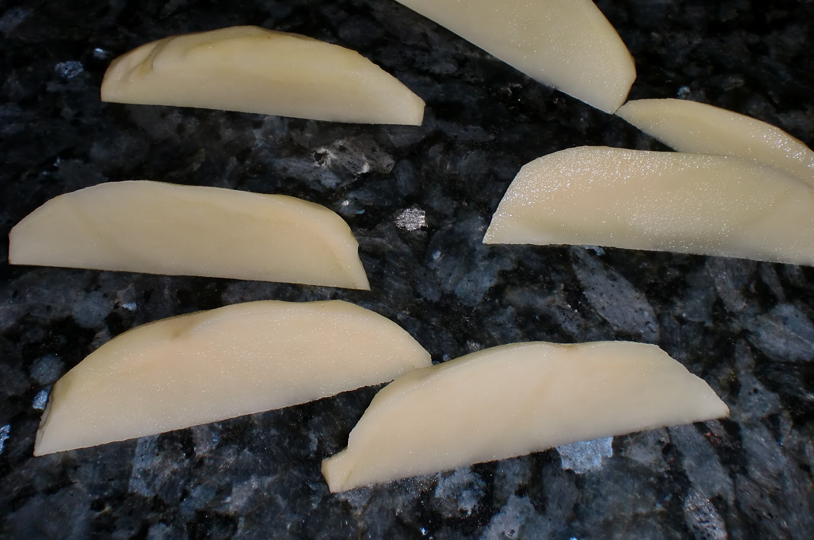 Una vez que tenemos las patatas frías las cortamos en gajos grandes y reservamos.
