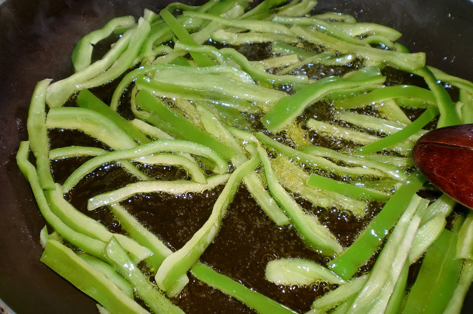 Ponemos el aceite en una sarten freimos los chilis verdes cortados en tiras.