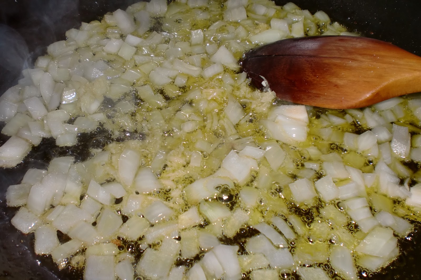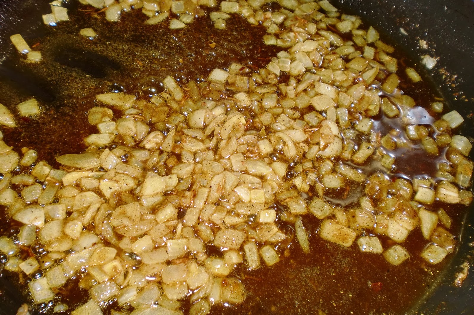 Cuando estén blandas agregaremos la sal, chili (o pimenton picante) en polvo, cilantro en polvo, el jengibre y la cúrcuma. Mezclamos hasta que las cebollas estén bien cubiertas de las especias.