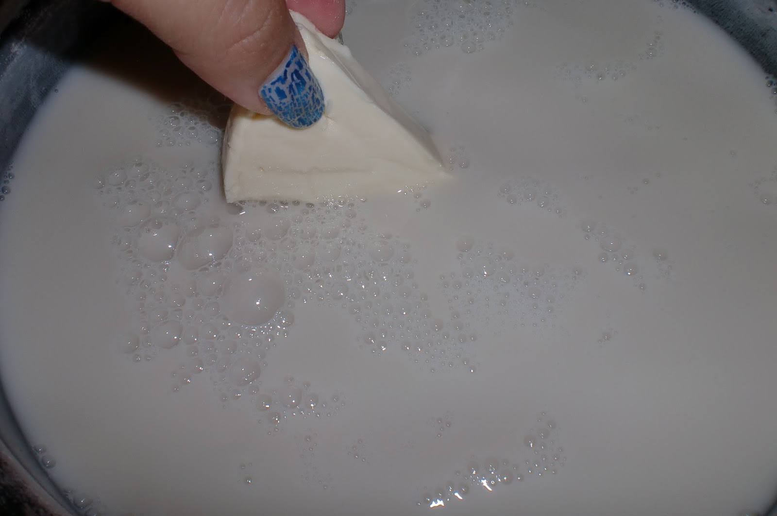 Luego en un cazo echamos la horchata, el azucar y los quesitos, lo ponemos al fuego hasta que los quesitos se desagan.