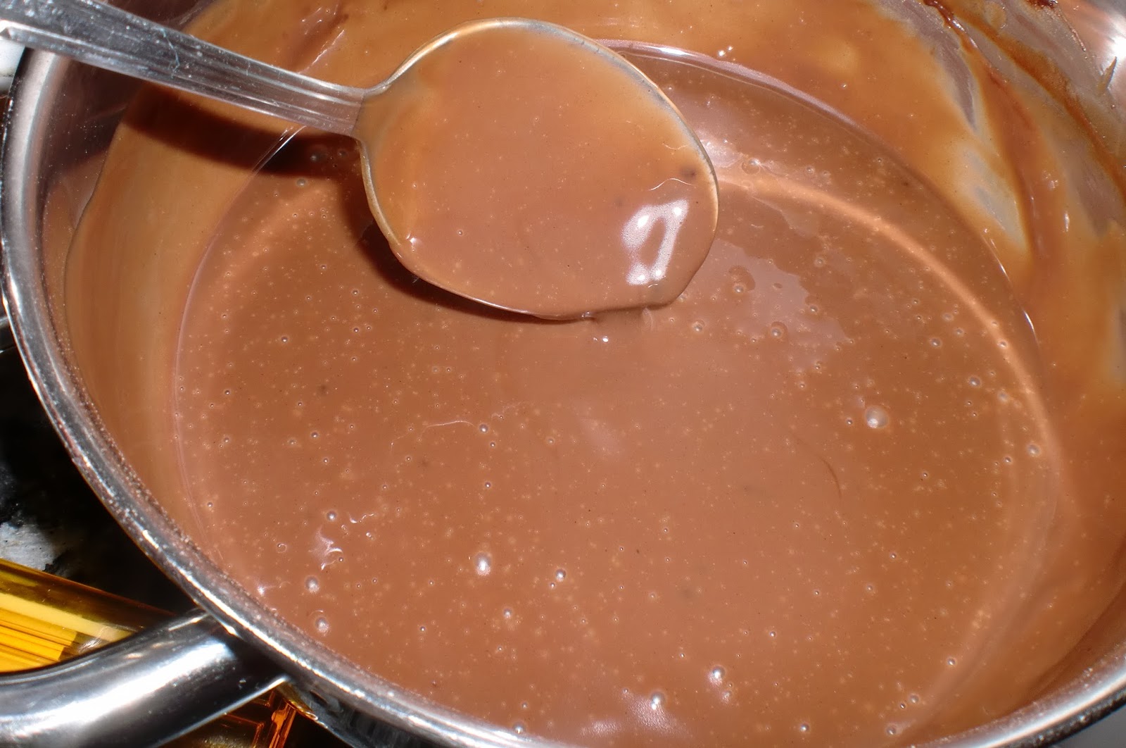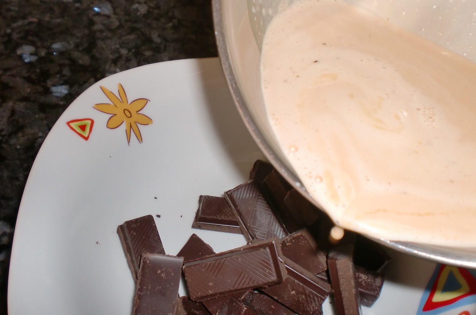 Vertemos sobre el chocolate poco a poco y removemos suavemente para que el chocolate se vaya derritiendo.