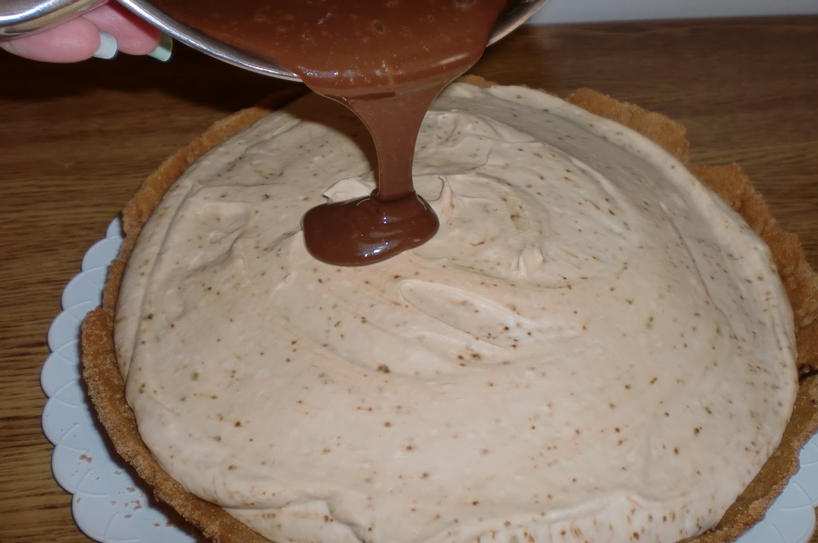 cuando la ganache este enfriada (importantiiiiiiiisimo, ojo, pues se bajaria la nata) ponemos la moka.