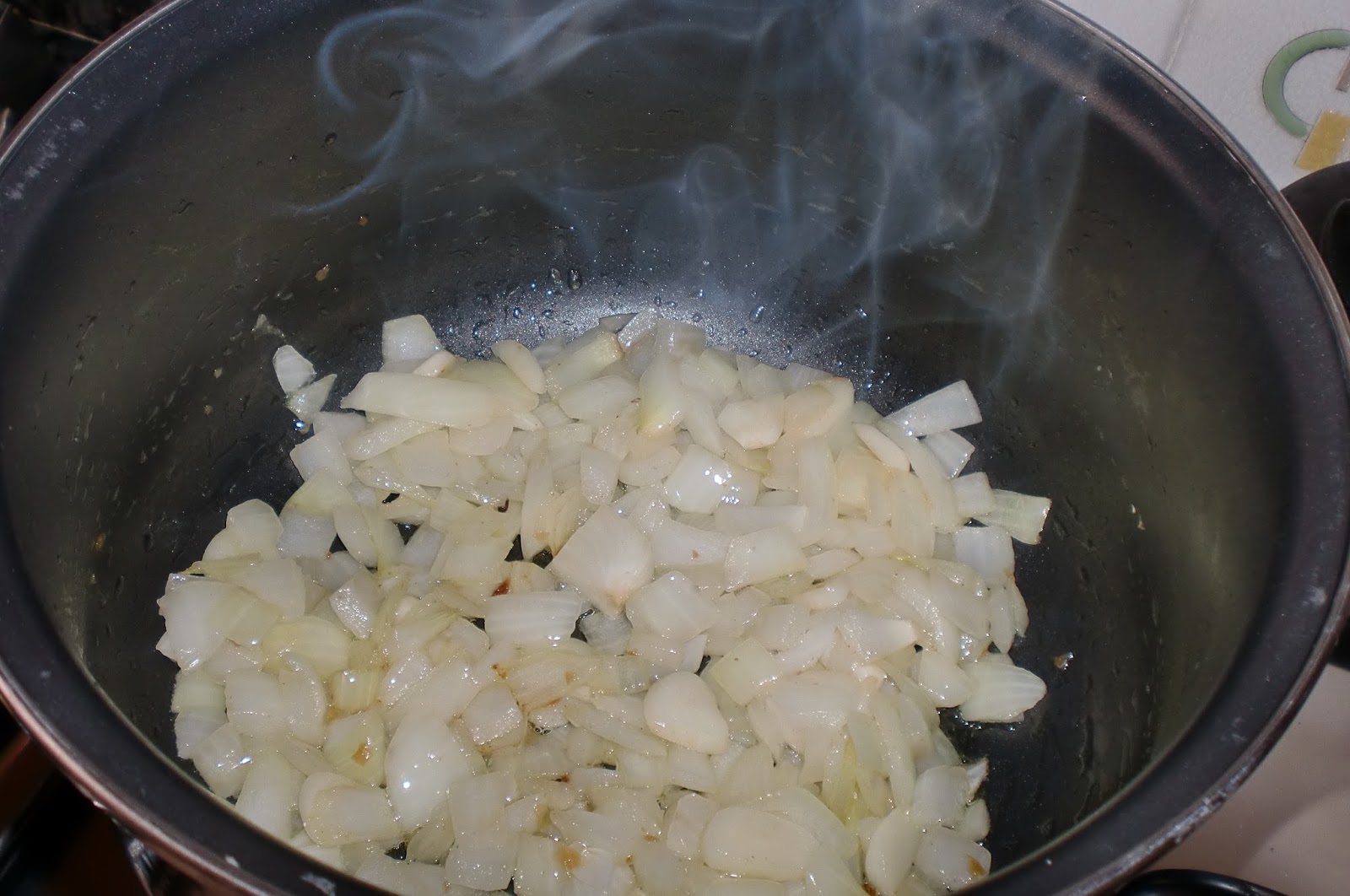 En ese mismo aceite (si falta añadis un poquito mas) sofreiremos la cebolla picada y los ajos laminados. El tamaño no importa pues luego vamos a triturar.