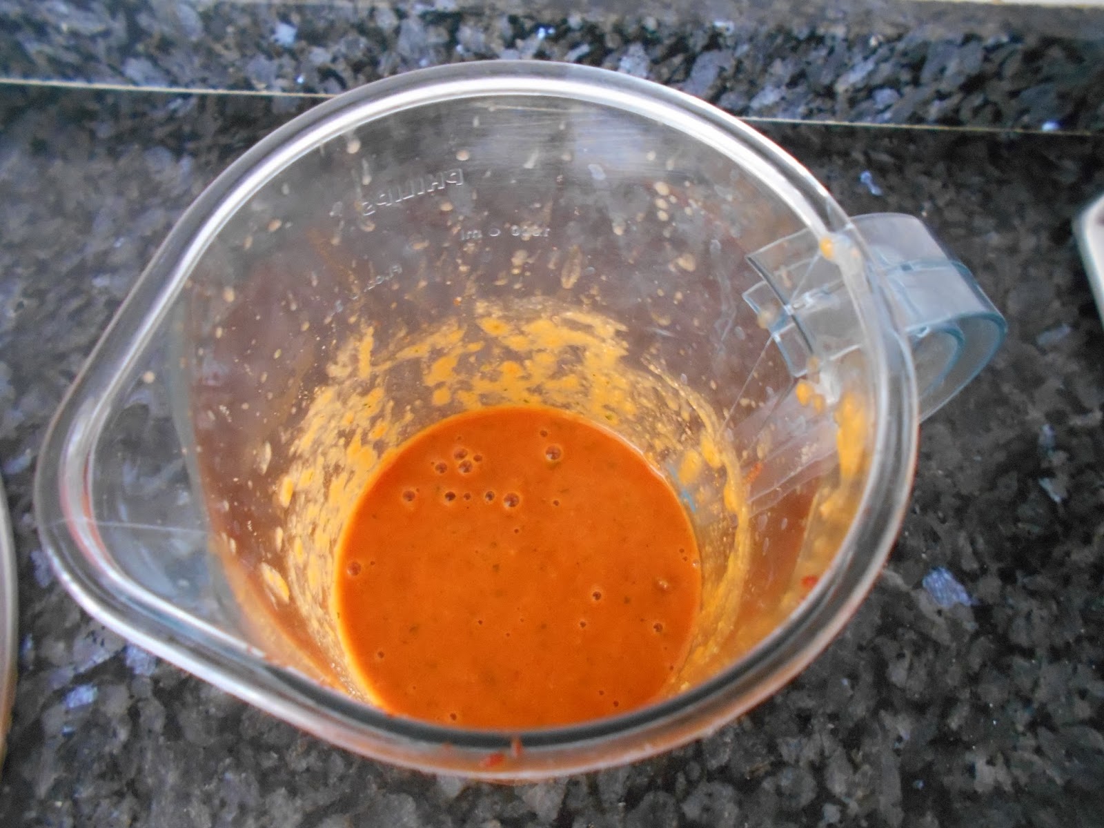 Cuando esté bien pochado lo sacamos a un vaso batidor y mezclamos el sofrito, el pan, el vino blanco, la carne de la ñora que teniamos hidratando, el comino, el perejil y la sal.