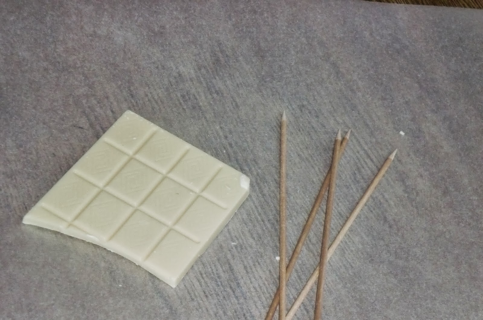 Ponemos los palos de brocheta cortados por la mitad, yo le pongo un poco de chocolate para que luego no se suelte el palo