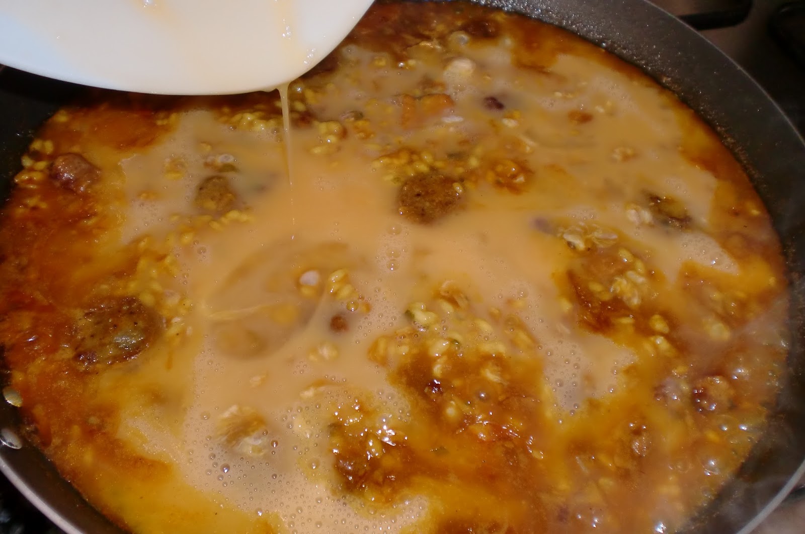 Añadimos el caldo del cocido, el tomate, perejil, el azafran y los garbanzos, cuando el caldo rompa a hervir añadimos el arroz.
