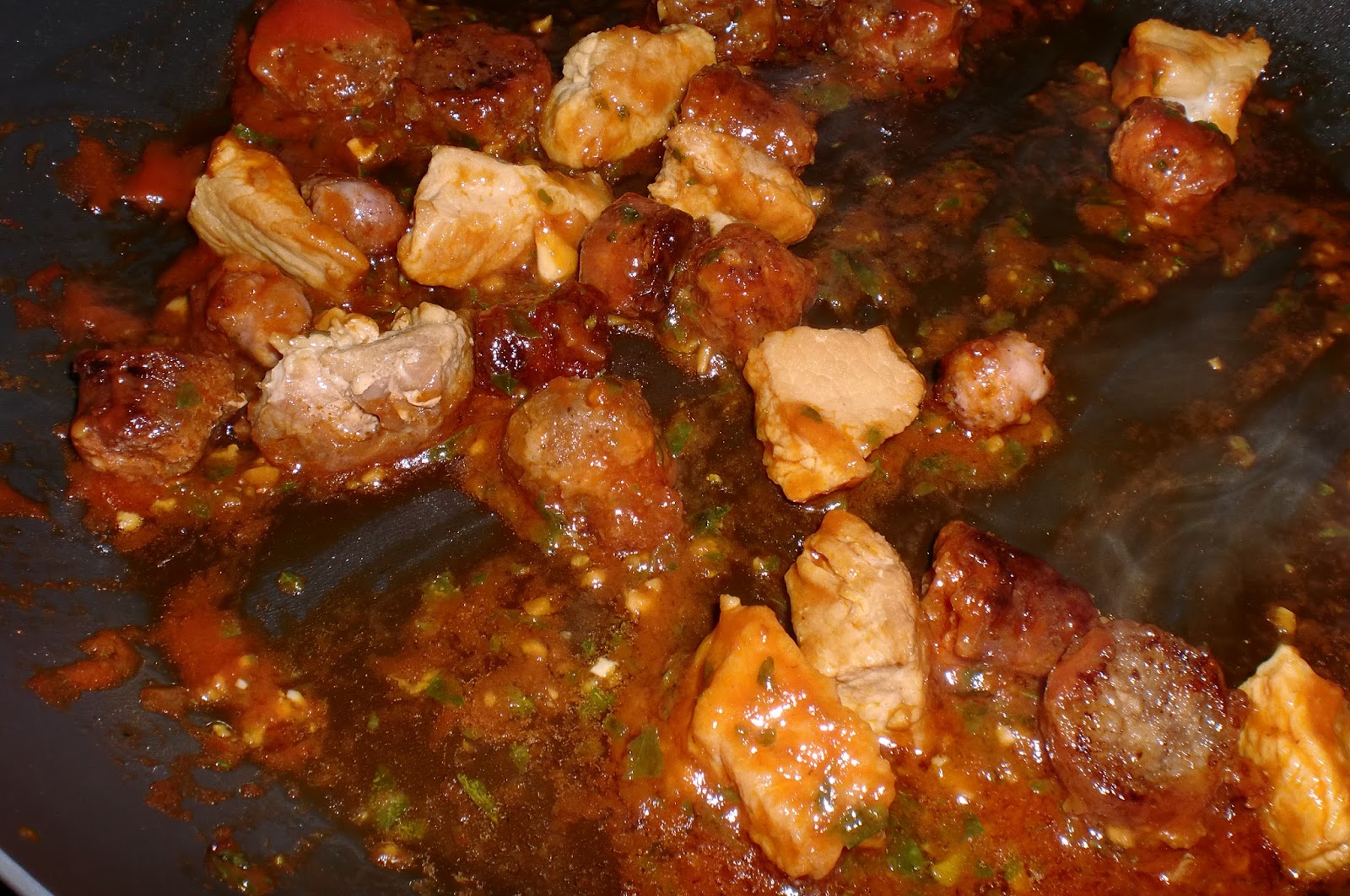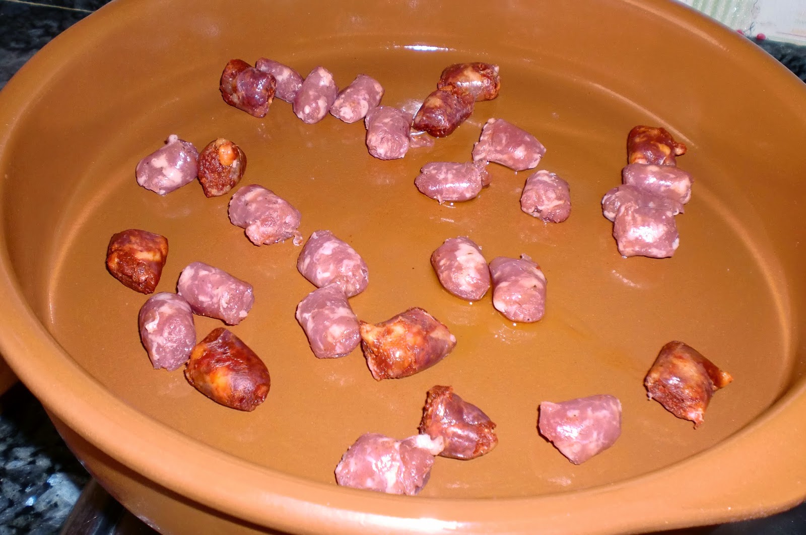 Empezamos dorando la carne y los embutidos en una sarten o cazuela con un poquito de aceite.
