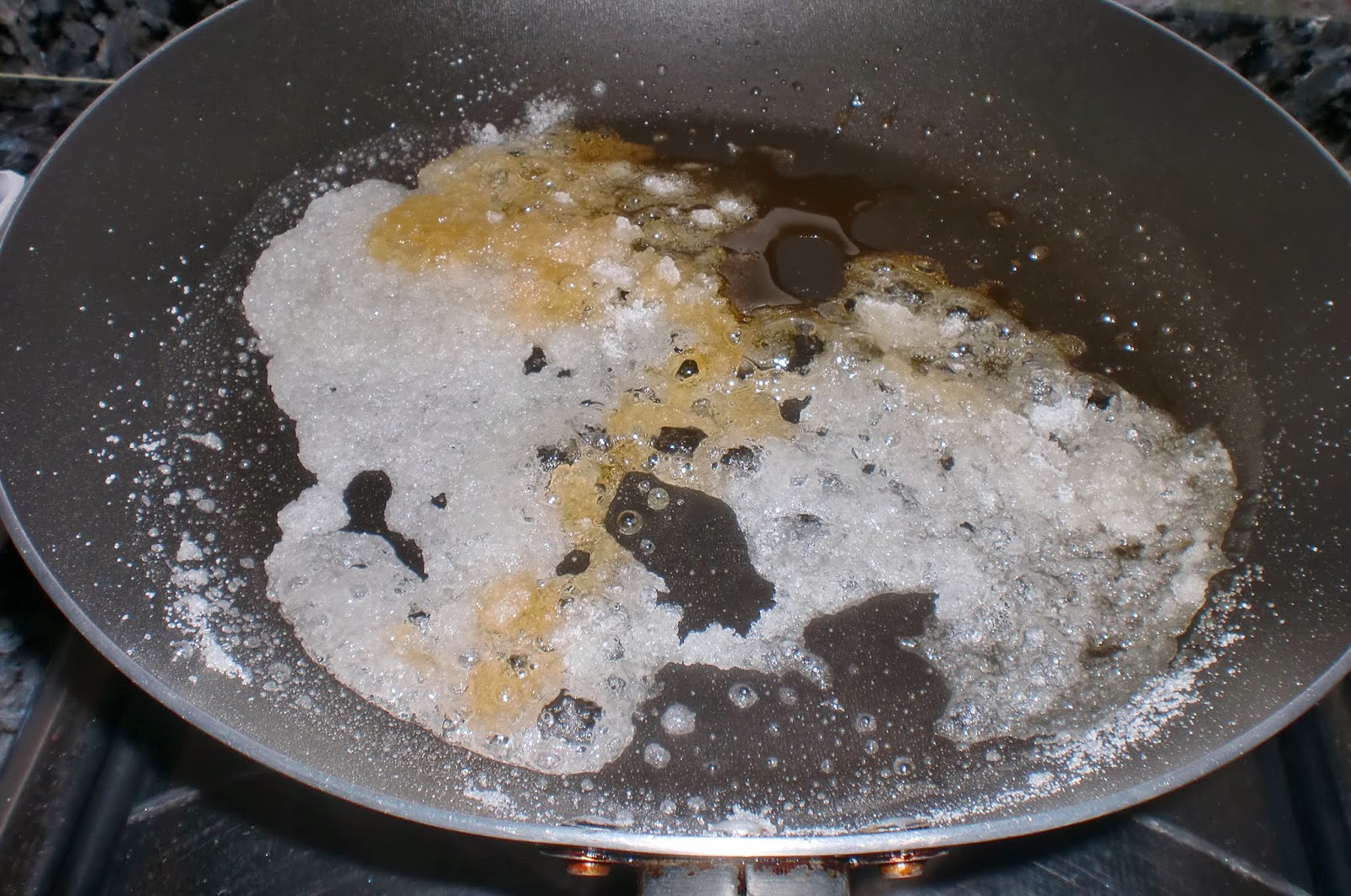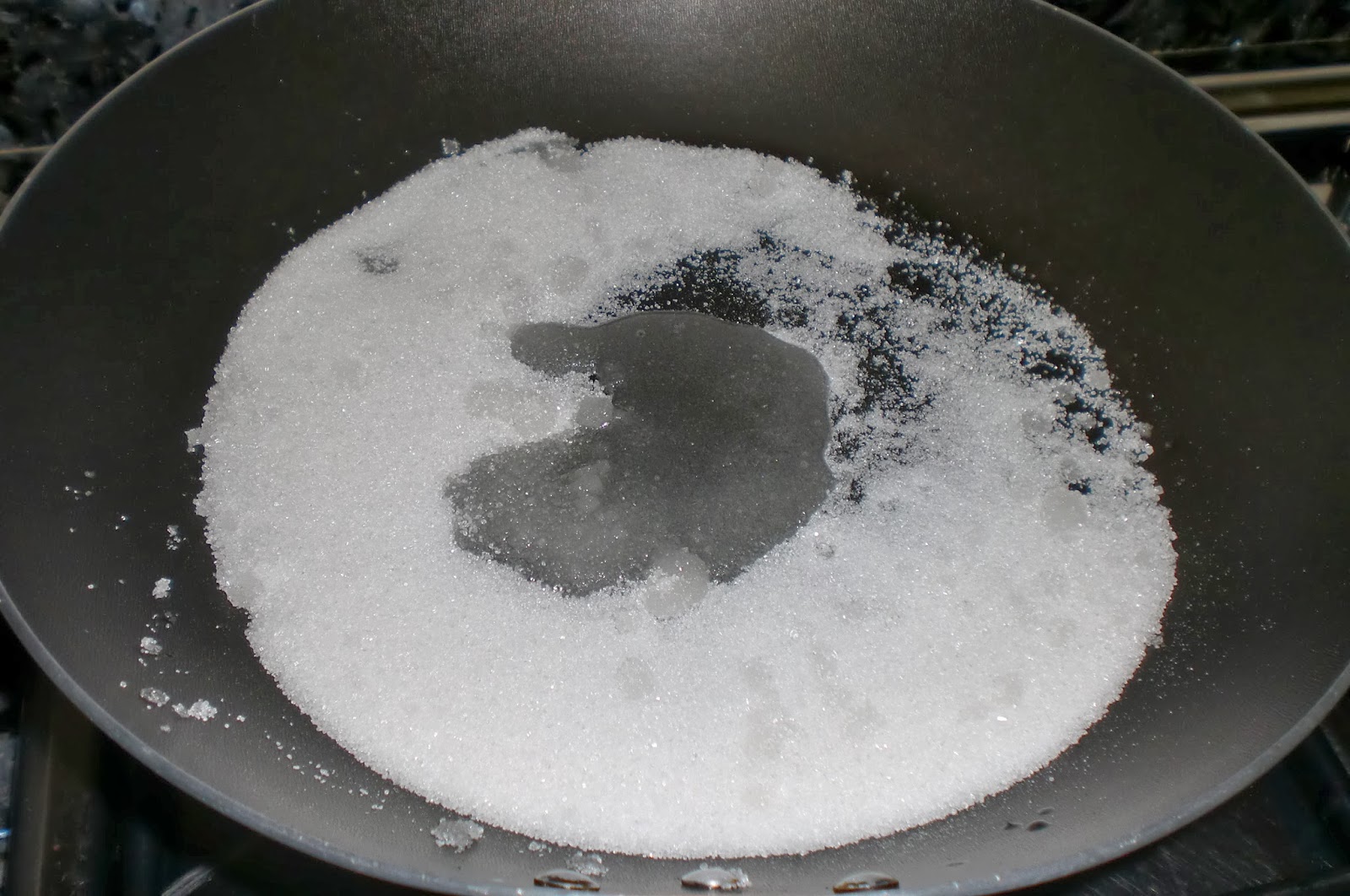 Ponemos una sarten antiadherente el azucar y lo calentamos hasta formar caramelo. No hace falta que pongais nada mas, solo azucar, ni agua ni limon…