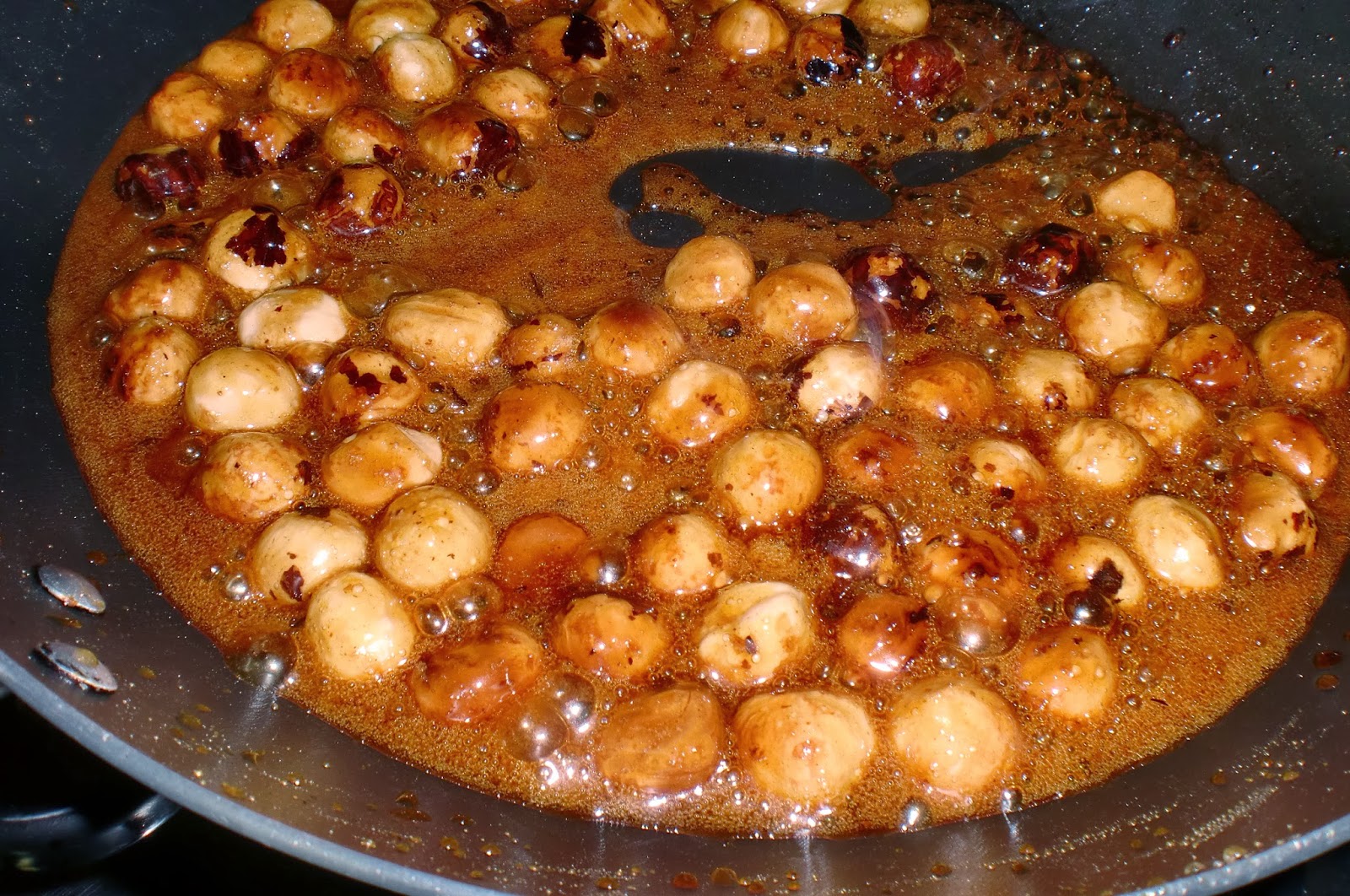 Cuando el caramelo tenga un tono dorado ligero añadimos las avellanas y gjrando la sarten dejamos que se mezclen bien.