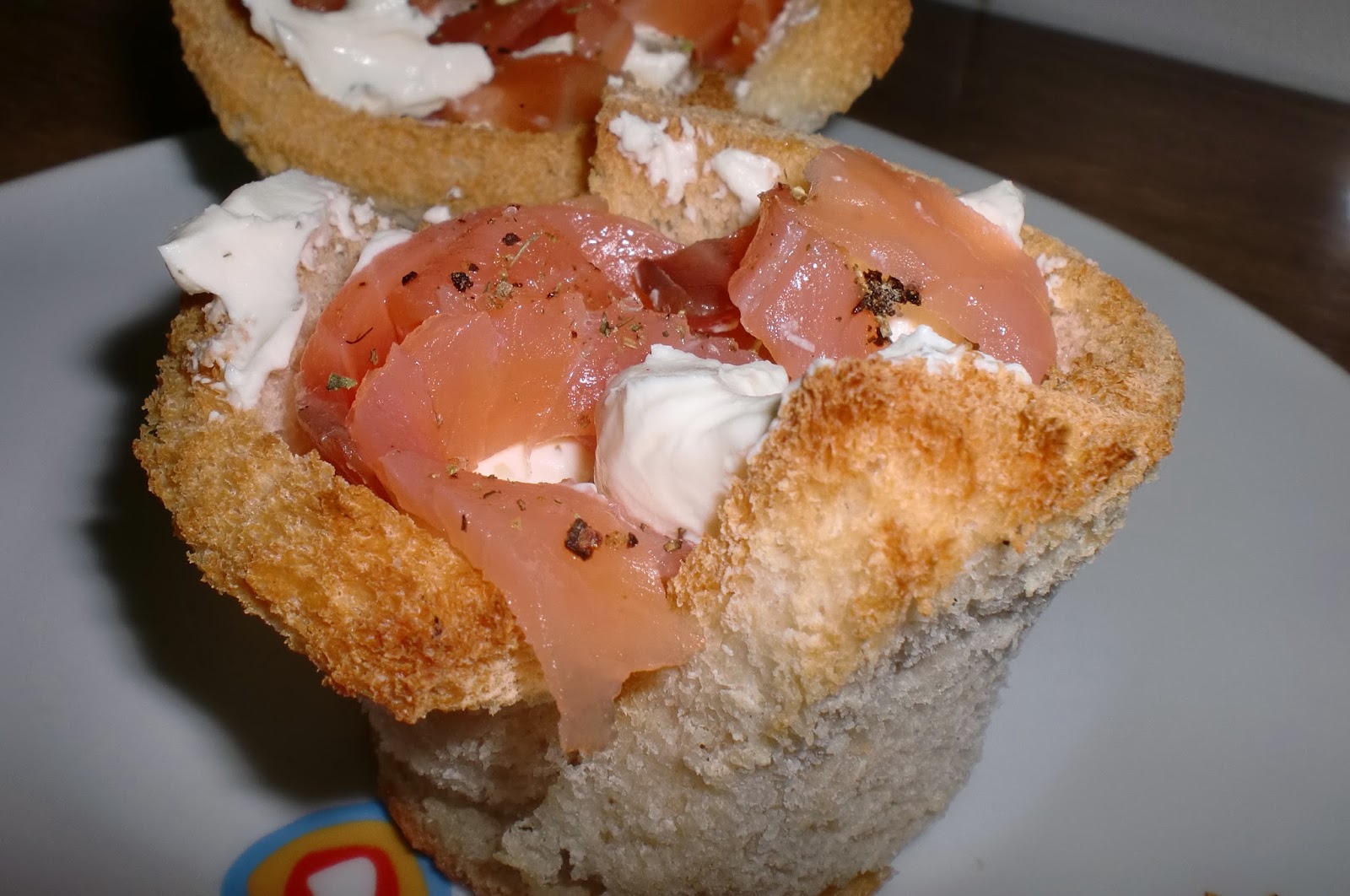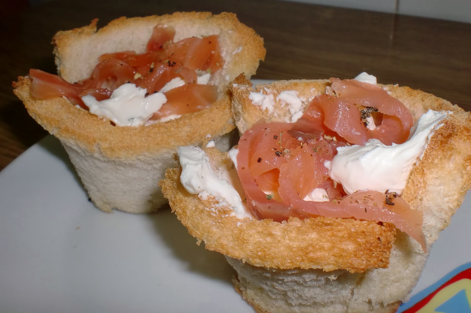 Sacamos nuetras cestas de los moldes y rellenamos con nuestros ingredientes elegidos en esta ocasion SALMON Y QUESO!!!!