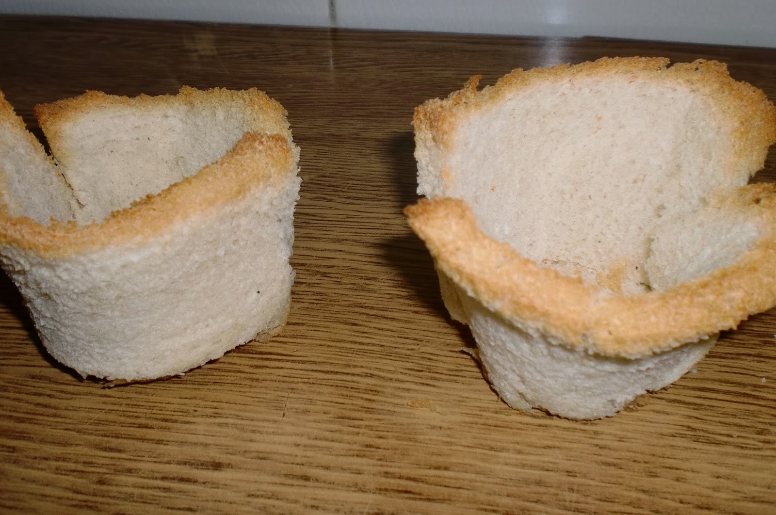 Cogemos unos moldes de flan, los embadurnamos de aceite. Los forramos con las lonchas de pan de molde