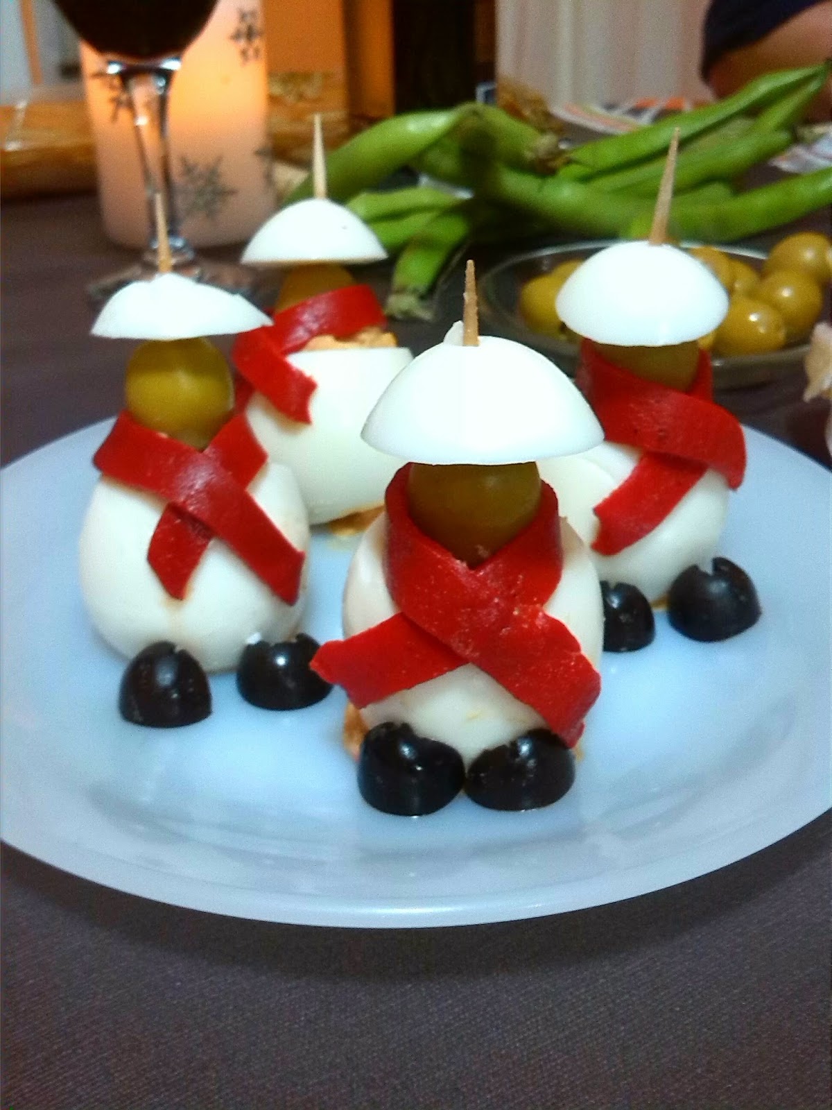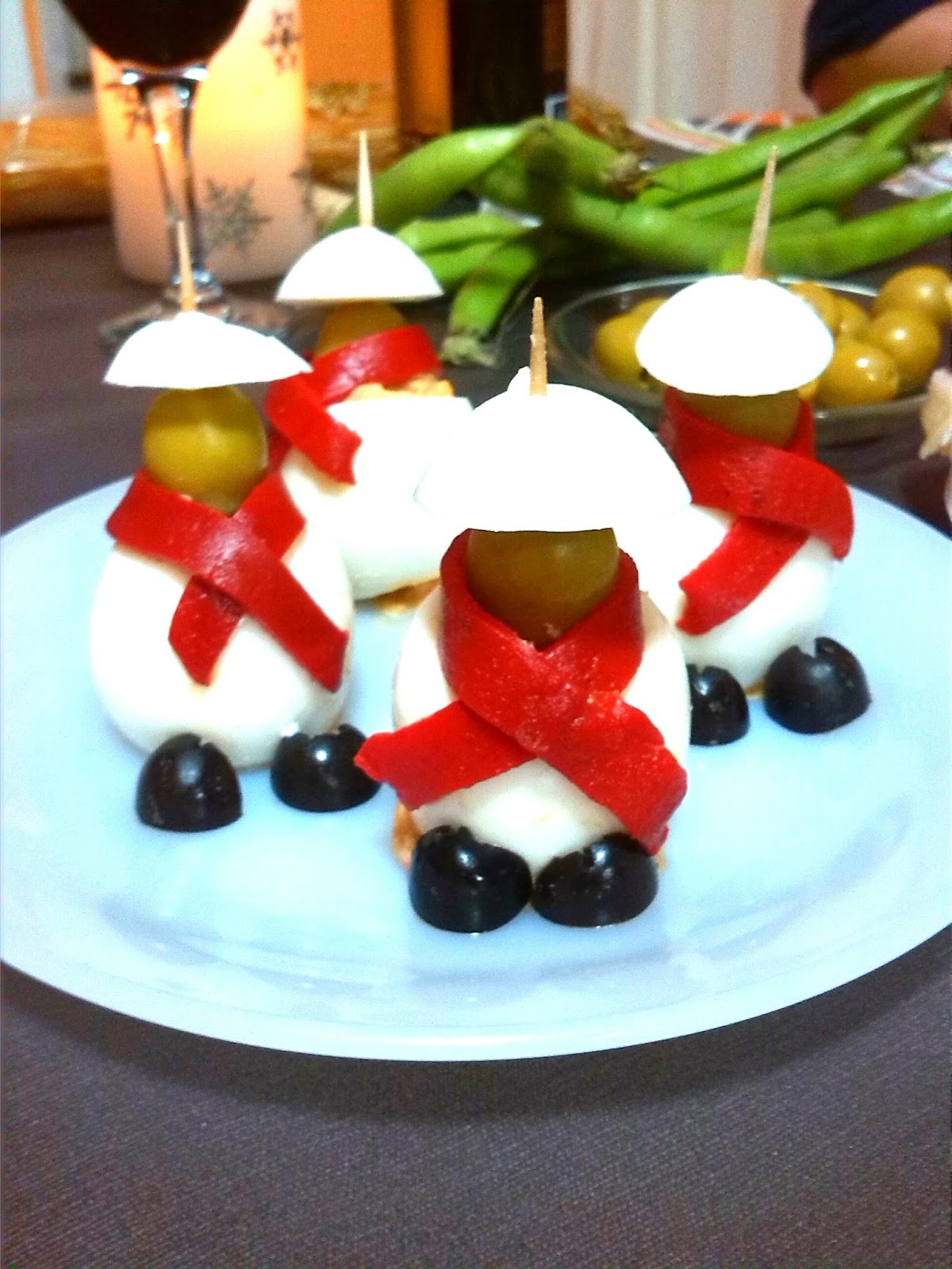 Terminaremos poniendoles de pañuelo una tira de pimiento del piquillo y los zapatos que los haremos con medias olivas negras.