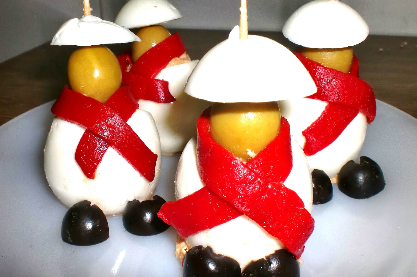 Pinchamos con un palillo una oliva verde (sera la cabeza) y una de las tapas que habiamos reservado y lo ponemos en cada huevo.