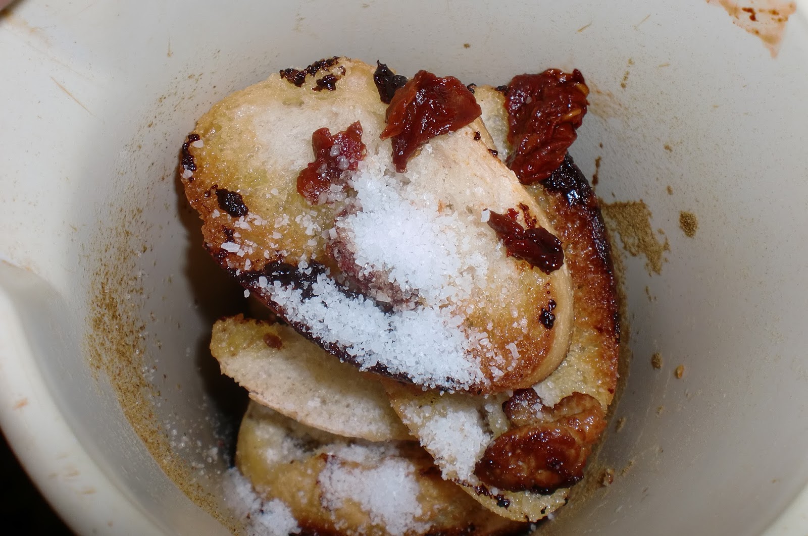 Cuando esté bien pochado lo sacamos a un vaso batidor y mezclamos el sofrito, el pan, el vino blanco, la carne de la ñora que teniamos hidratando, el comino, clavo, el perejil y la sal.