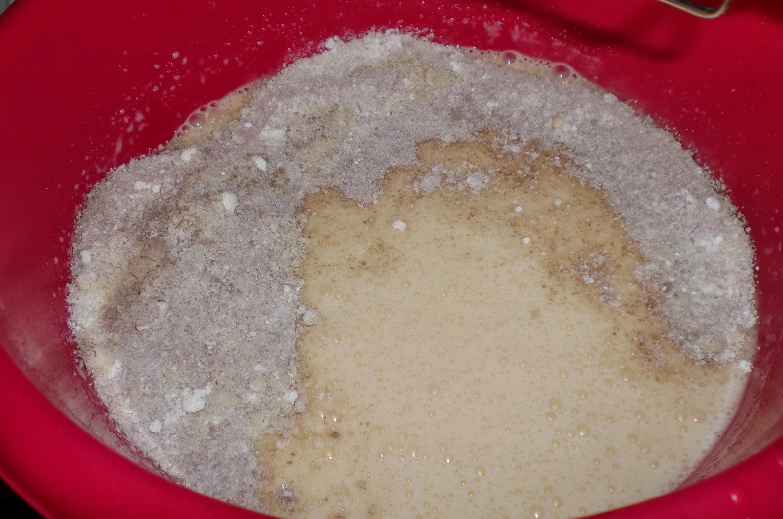 En otro recipiente mezclaremos la harina, la almendra molida, la levadura, el cacao y la pizca de sal. Se lo vamos agregando poco a poco a la mezcla de huevos.