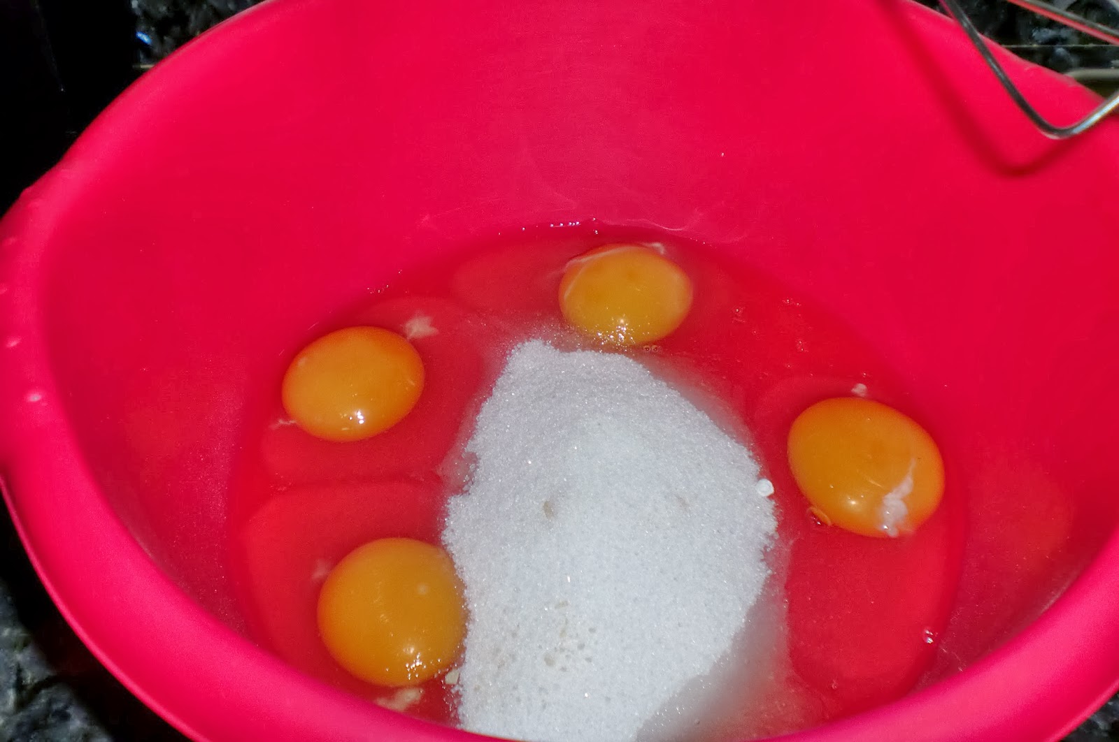 Ponemos en un cuenco los huevos y el azúcar, batimos con las varillas hasta que hayan blanqueado.