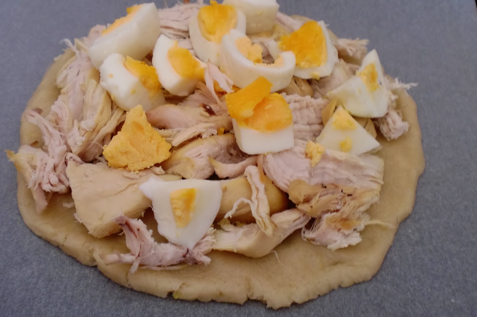 Ponemos uno de los circulos en una bandeja de horno con papel de hornear, disponemos los trozos de pollo y de huevo duro