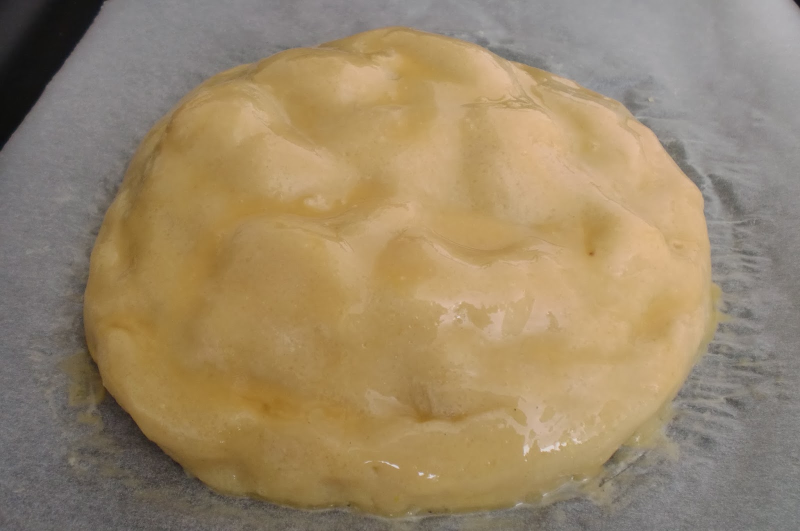 Estiramos la masa ente dos hojas de papel de horno (porque se pega un poco y asi es más facil de manejar)