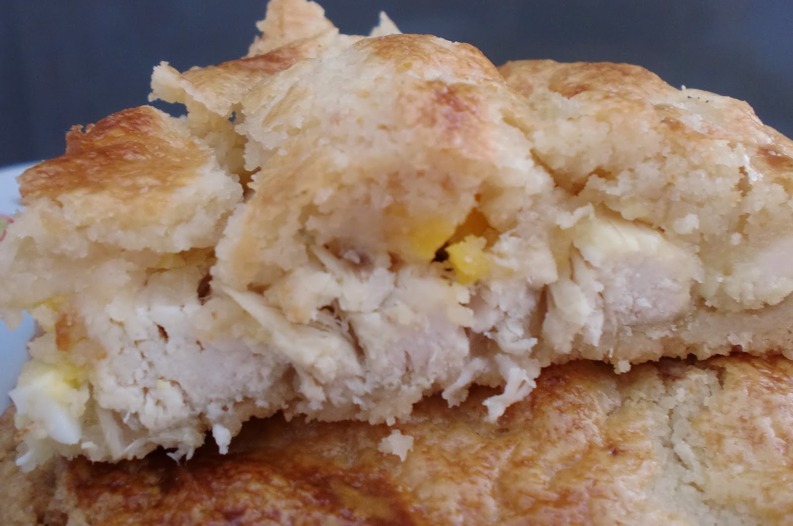 El pastel es muy sencillo, consiste en una masa dulce y aromática rellena de pollo, este contraste dulce-salado es lo más característico y aunque puede chocar un poco, es la gracia del pastel.