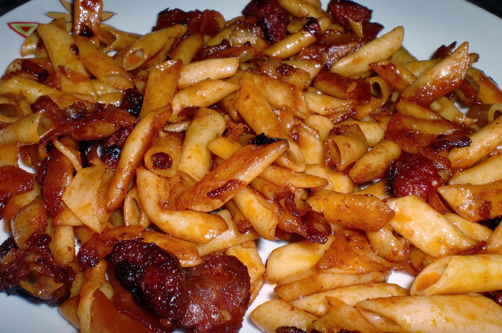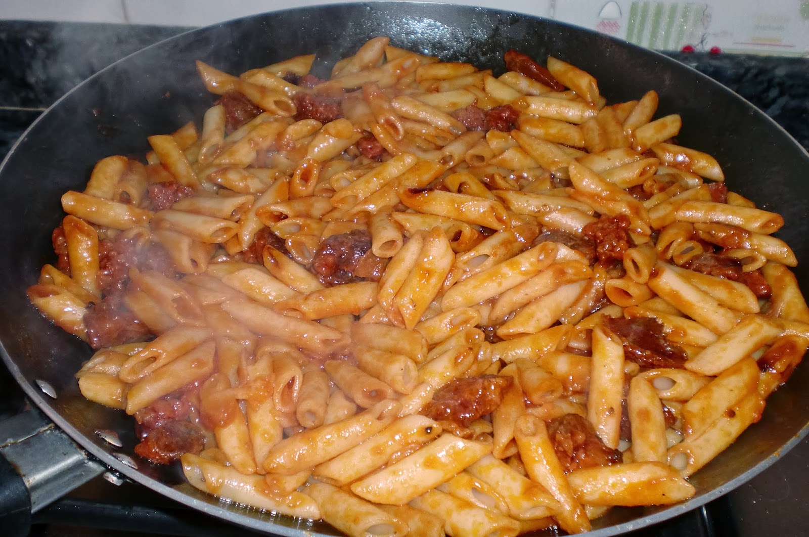 Cuando esten los macarrones listos, los escurrimos ligeramente y los añadimos a la sarten con la cebolla y los chorizos.