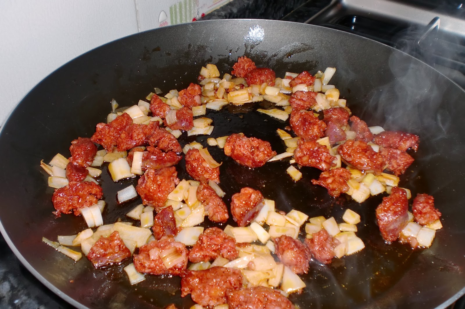 Cuando este algo transparente añadiremos los chorizos picados al gusto.
