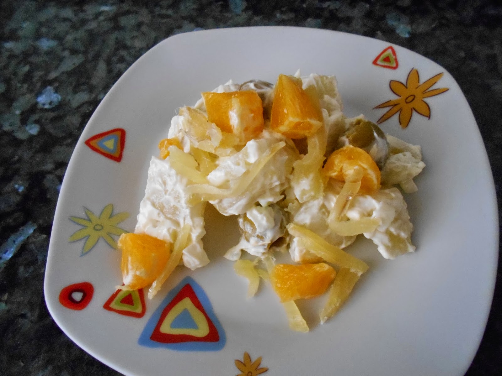 En un recipiente mezclamos los ingredientes de la ensalada a excepcion de la naranja que la añadiremos en el momento final para que no pierda sus propiedades.