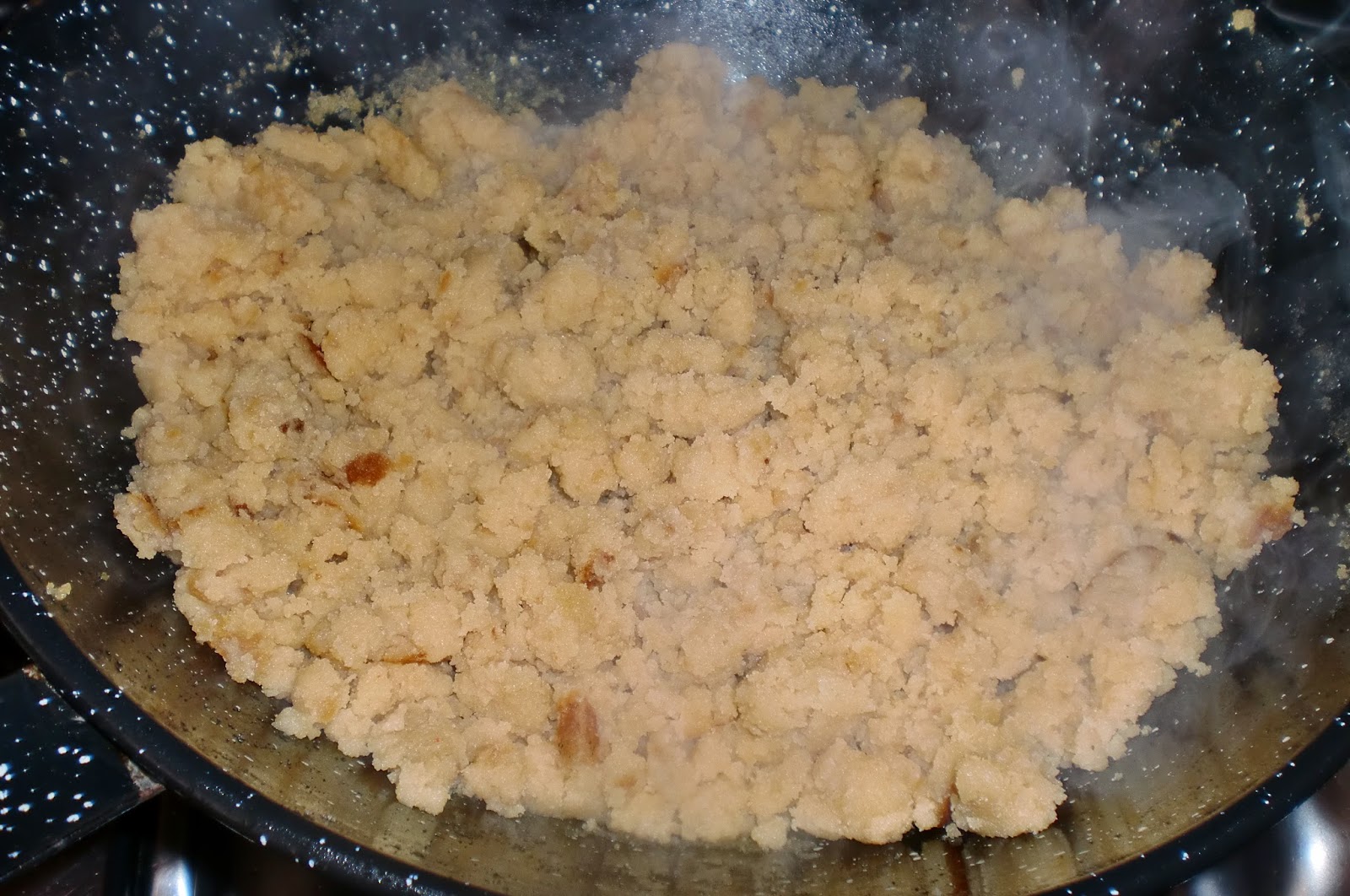 Vamos cortando con una rasera para ir formando las migas. Tardan en cocinarse desde que tenemos la bola hasta que estan unos 30min.