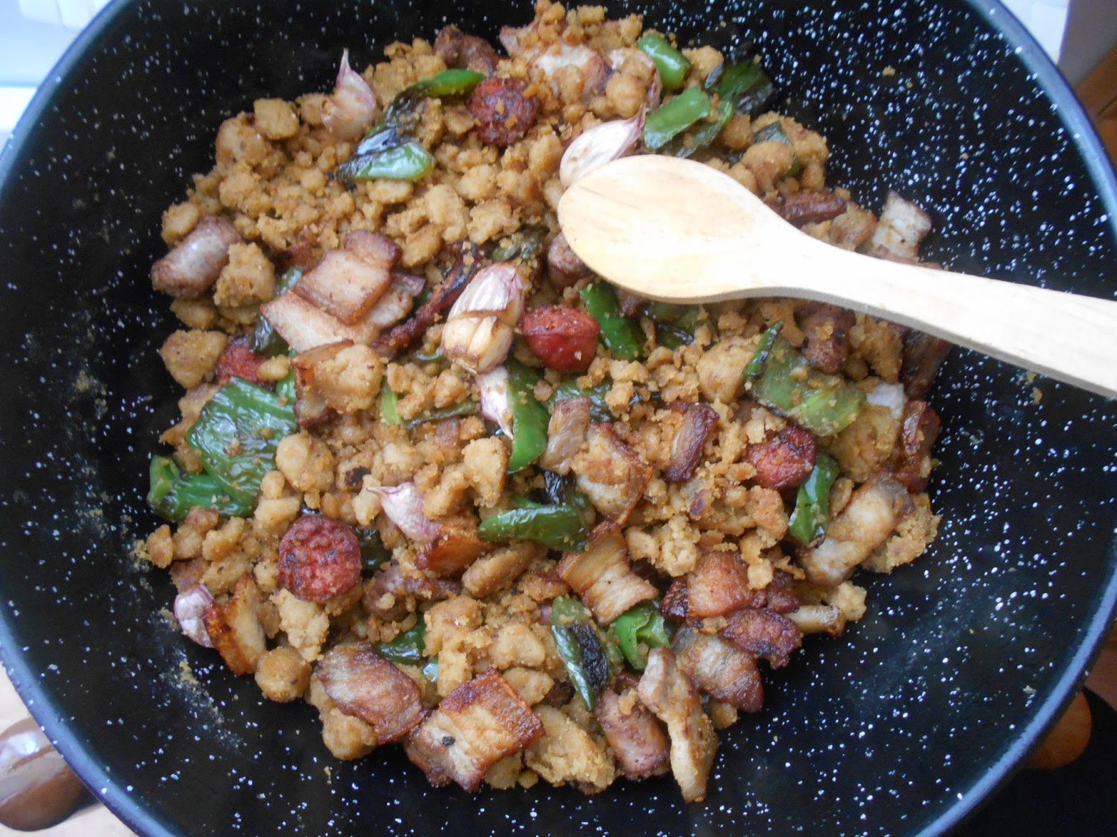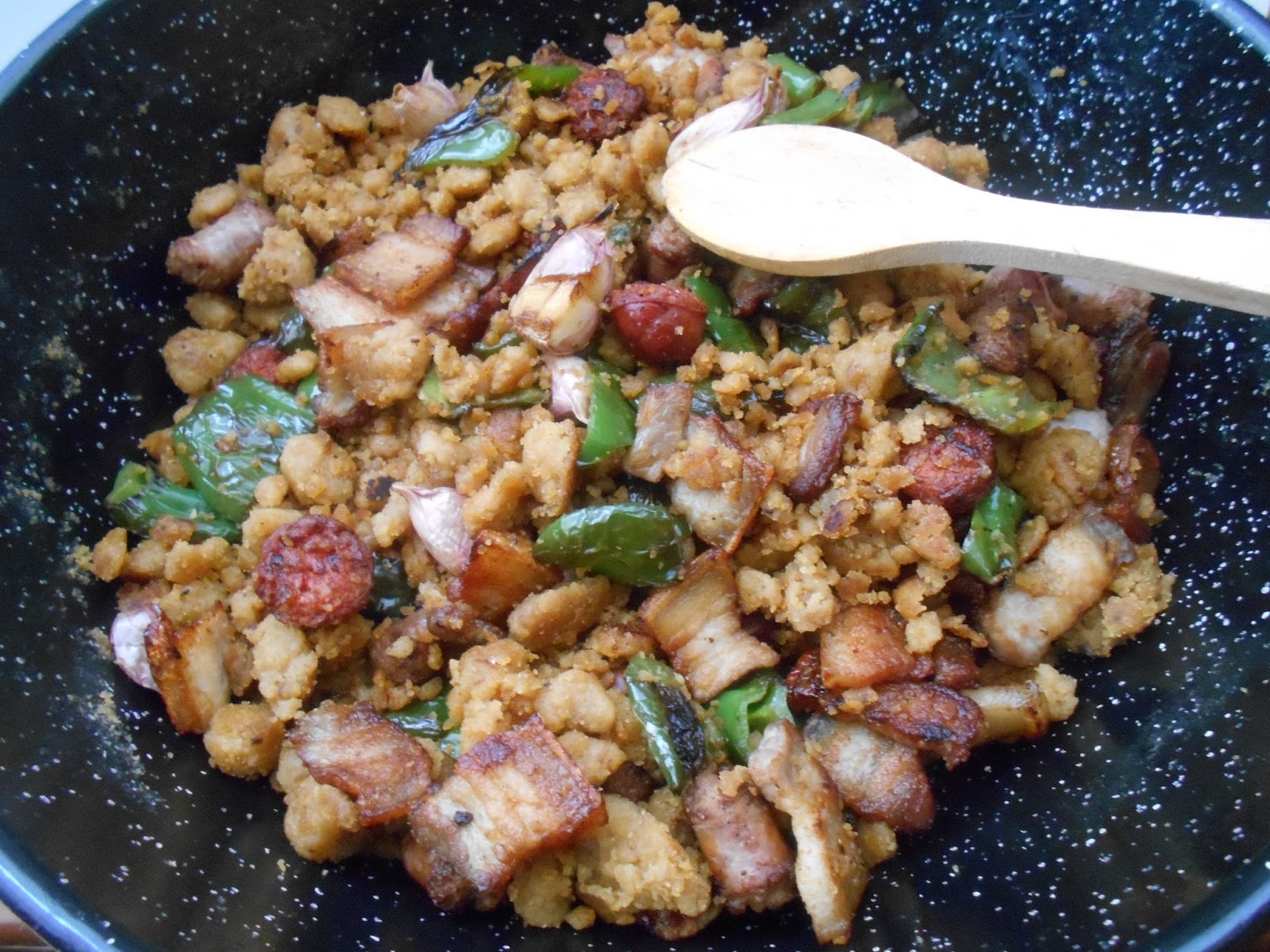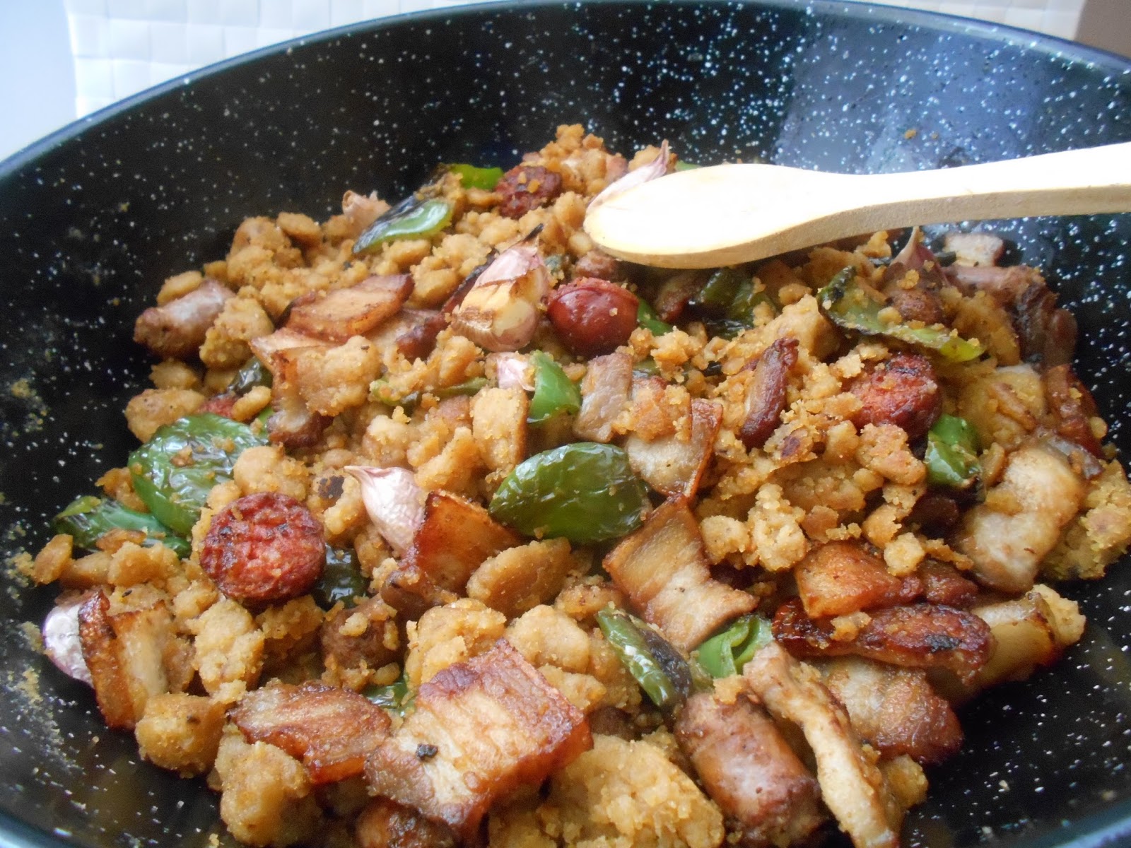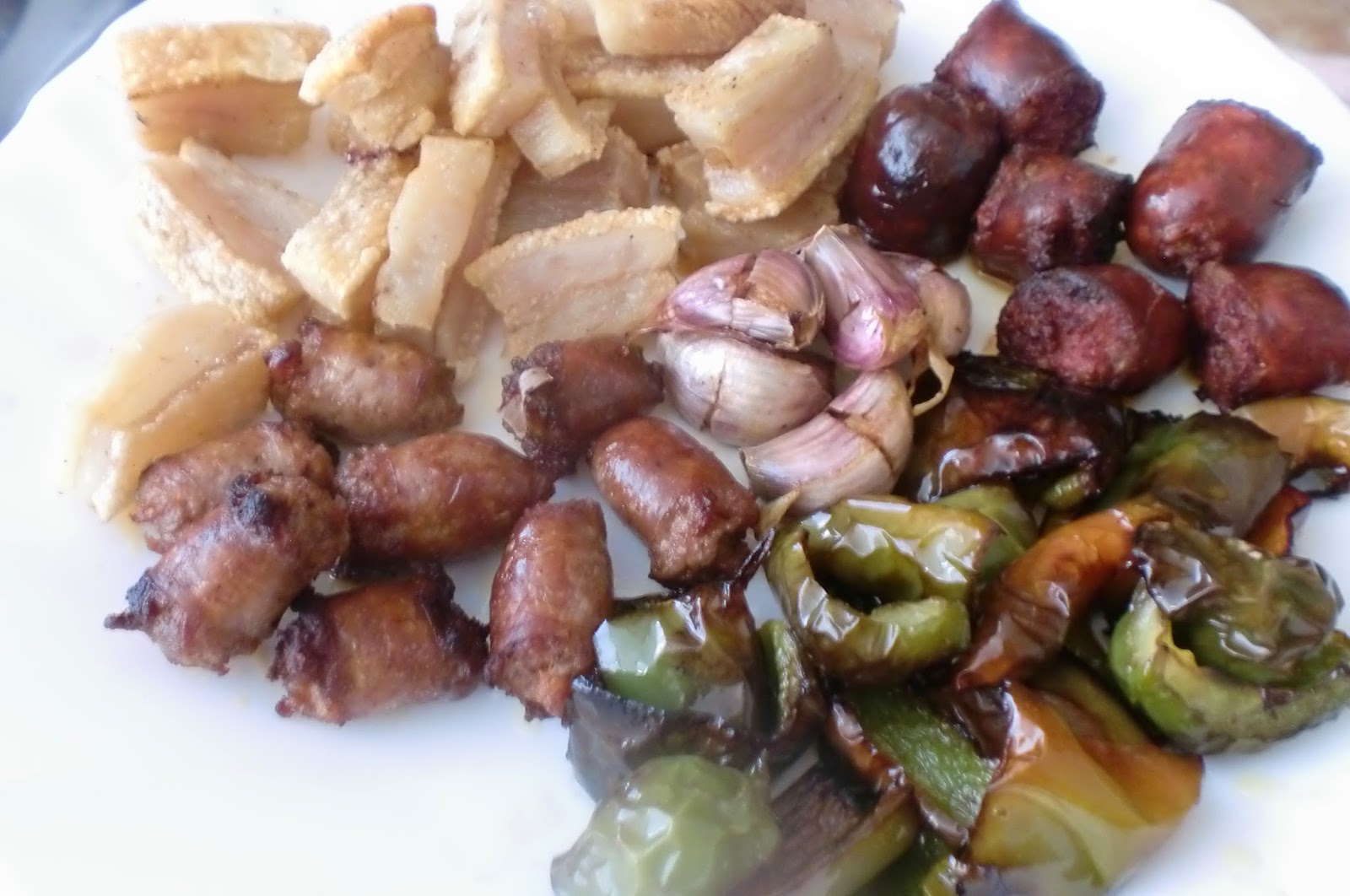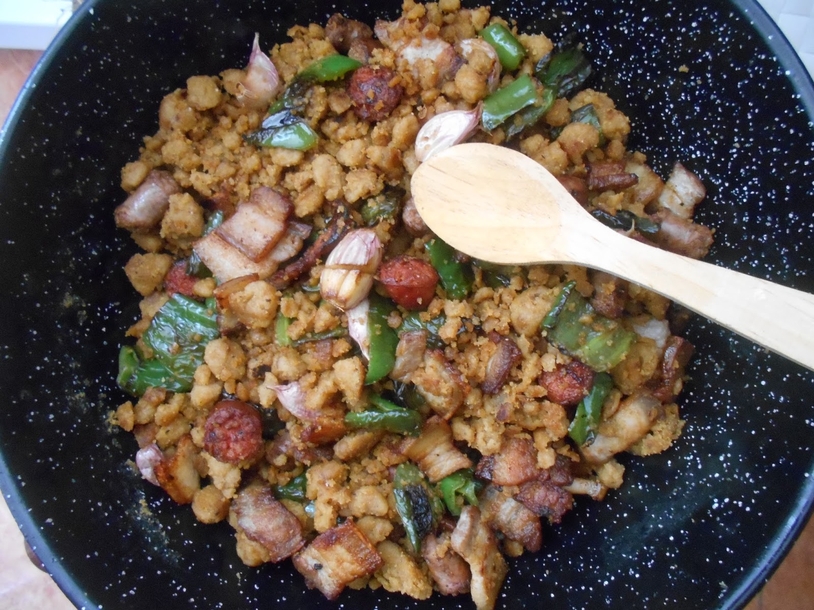 Arreglo o acompañamiento: pimiento verde, salchichas, longanizas y tocino o panceta.