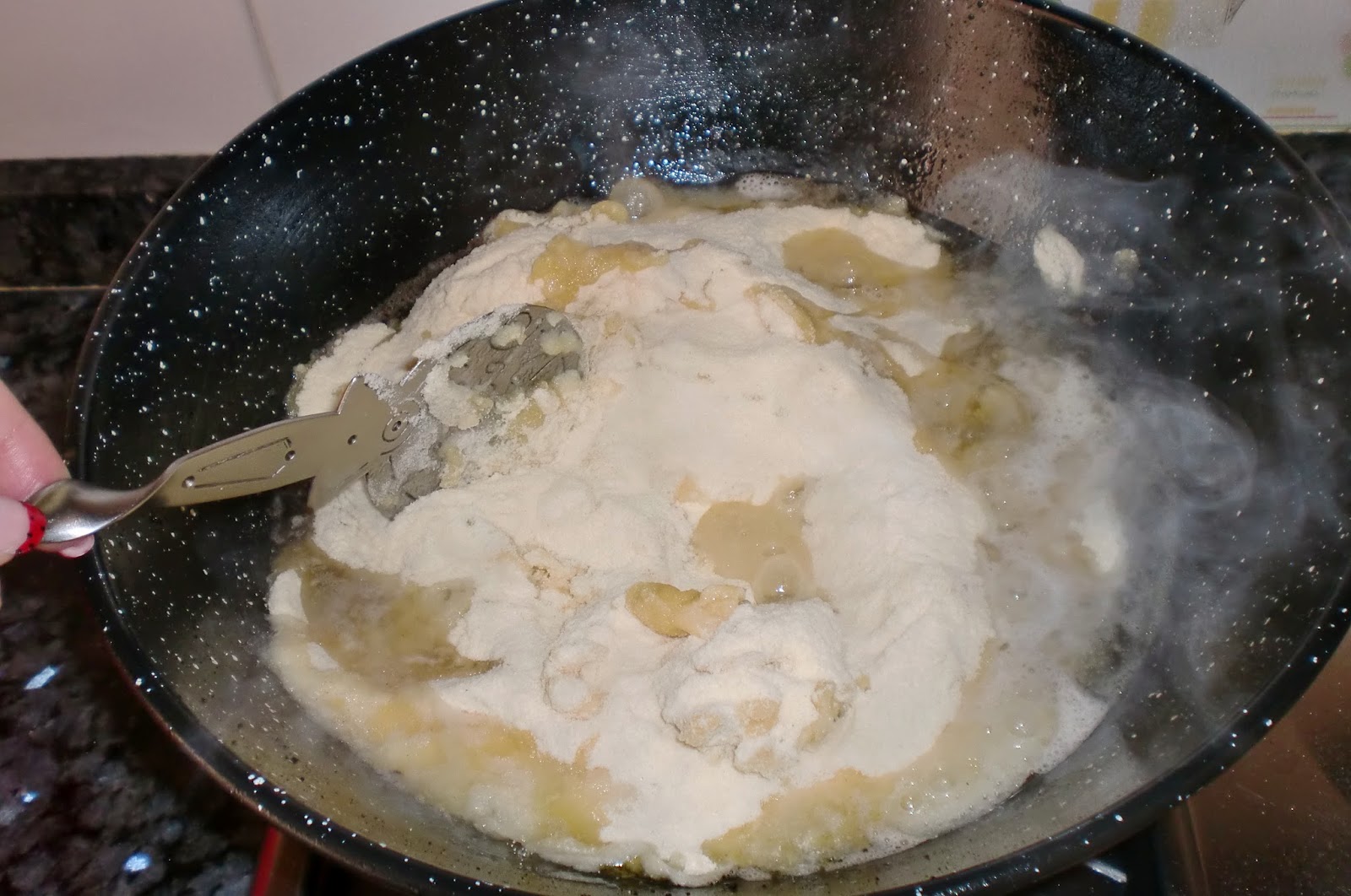 Cuando este hirviendo, añadimos la harina y la movemos hasta formar una masa.