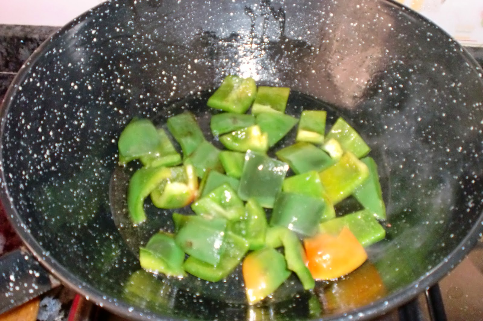 Empezamos a sofreir con la mitad del aceite, es decir, unos 75ml los pimientos.