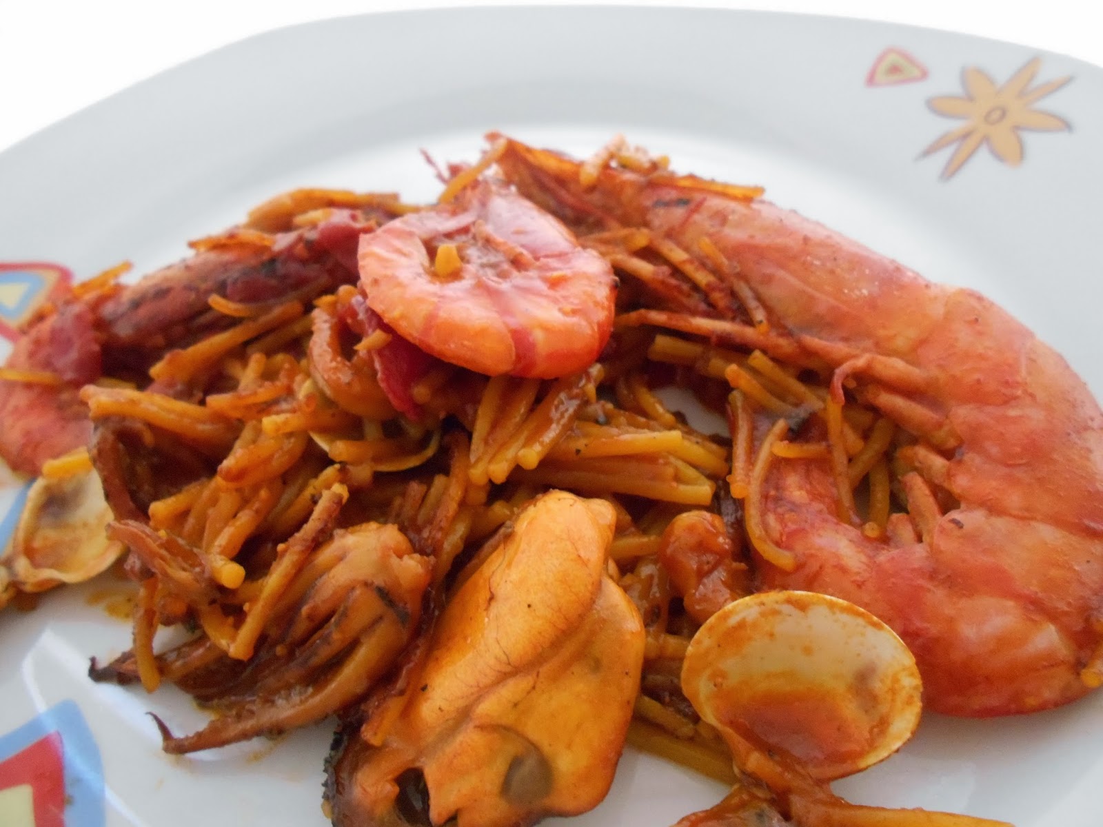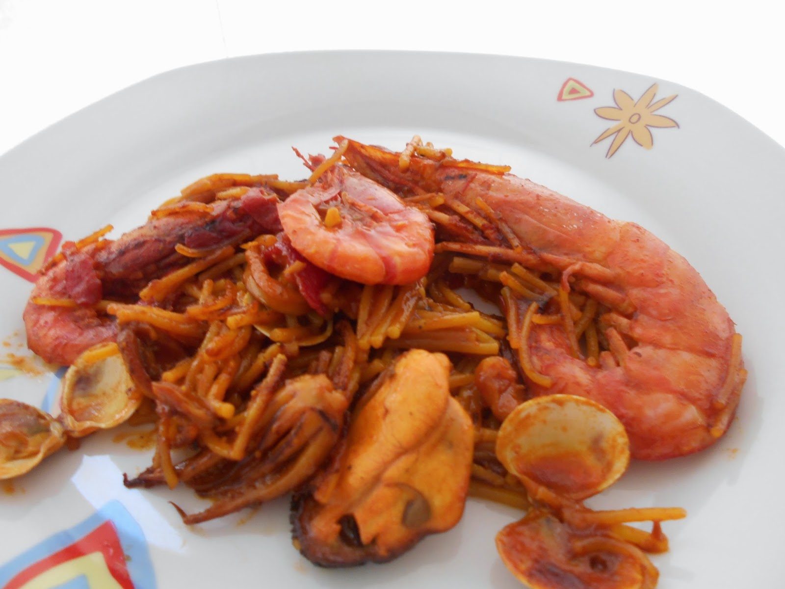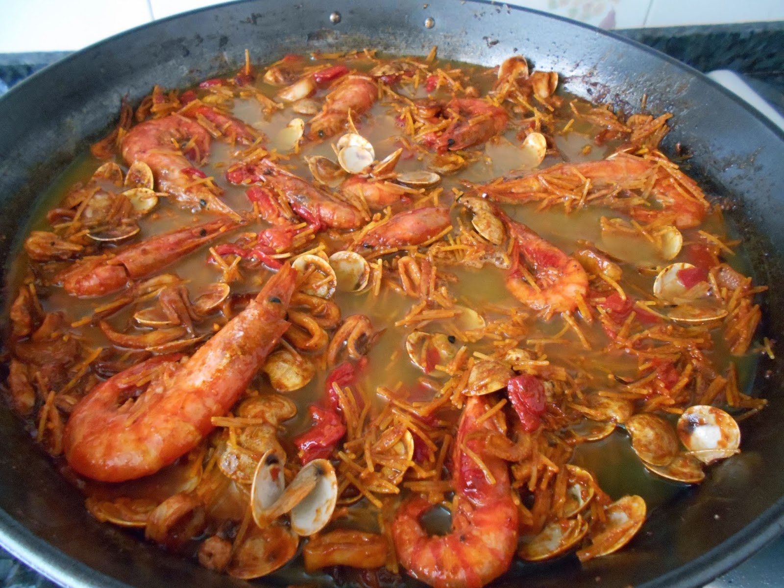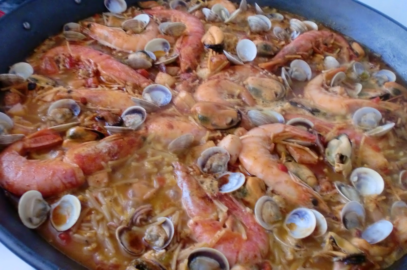 El fideuá de marisco es algo parecido a la paella que todos conocemos, pero en vez de usar arroz, usamos fideos.