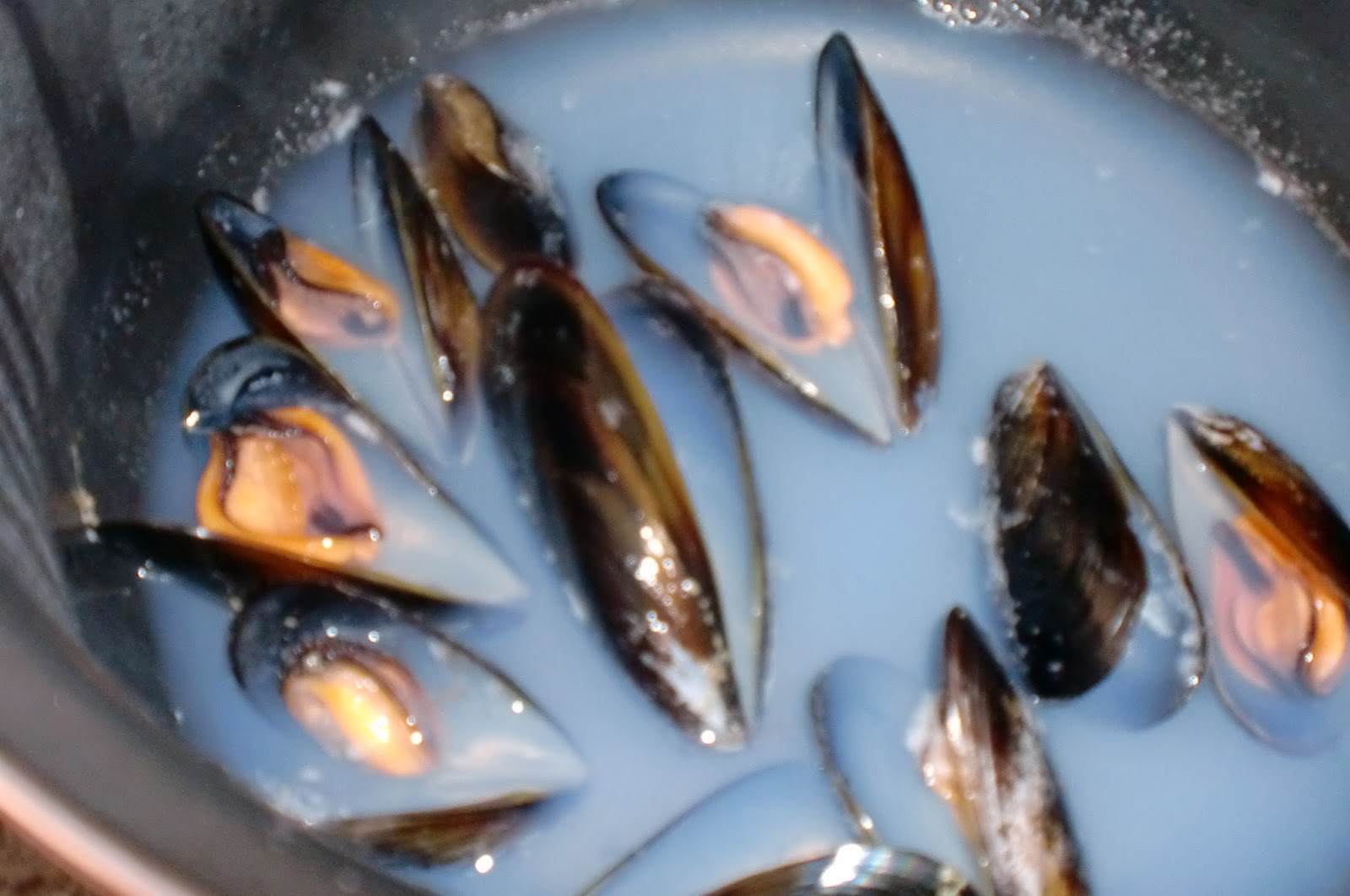 Vertemos el caldo bien colado y agregamos las mollas de los mejillones