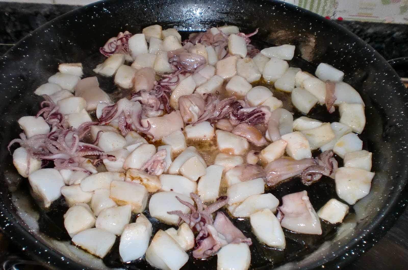 Cortamos en trocitos los calamares y la sepia, los doramos en la paella en el aceite de freir los pimientos.