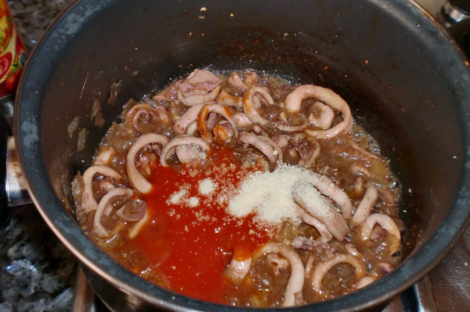 vertemos el agua y dejamos hervir a fuego medio hasta que los calamares esten tiernos y se reduzca la salsa.